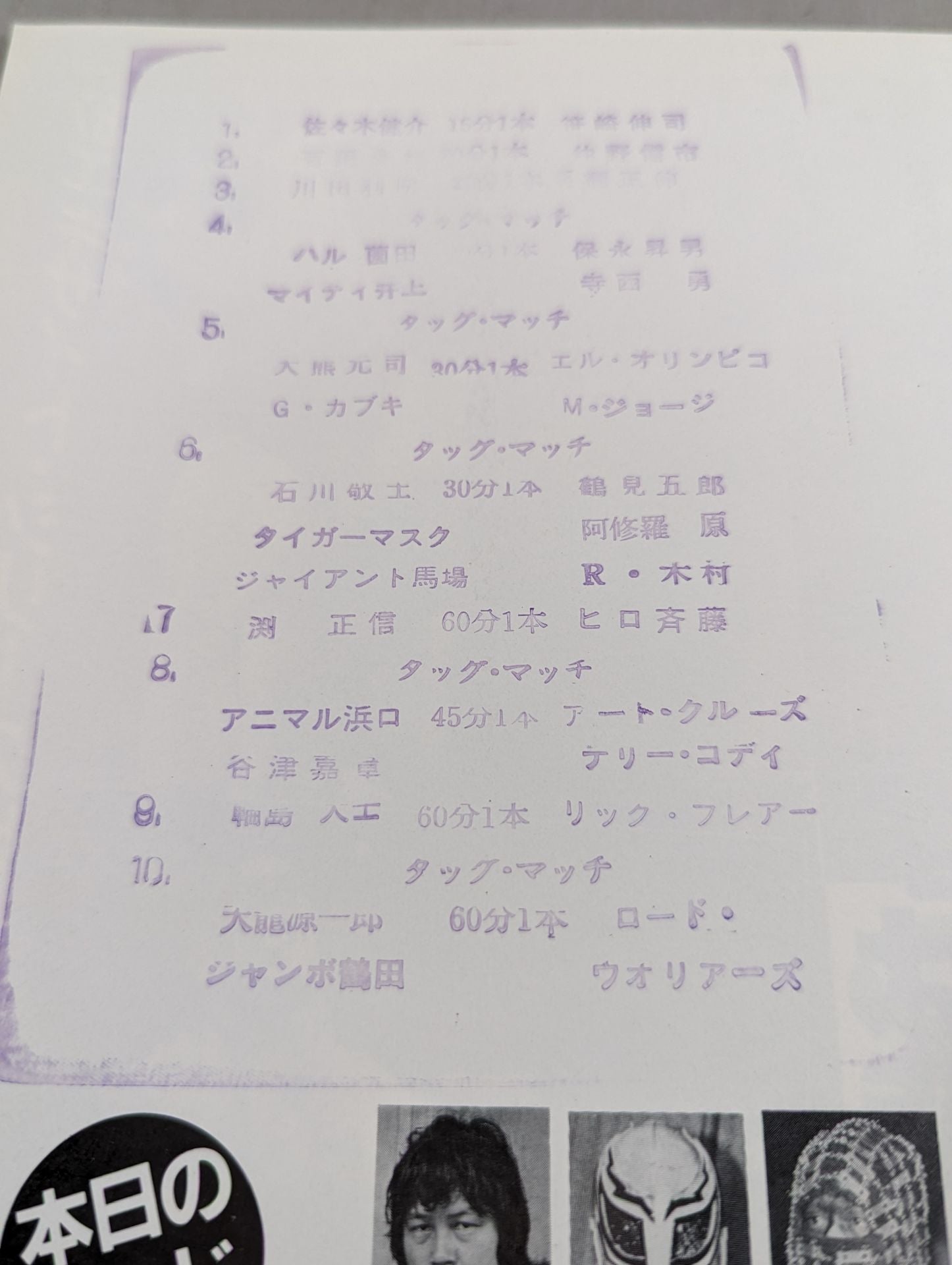 1987 Venue: Japan Budokan (Final Match) / Stamped with List of Matches : International Tag Teamfighters Match] Tenryu Genichiro & Jumbo Tsuruta vs The Road Warriors (Hawk Warrior) & Animal Warrior) / [NWA World Heavyweight Fighters Rights Match] Daishi Wajima vs Ric Flair