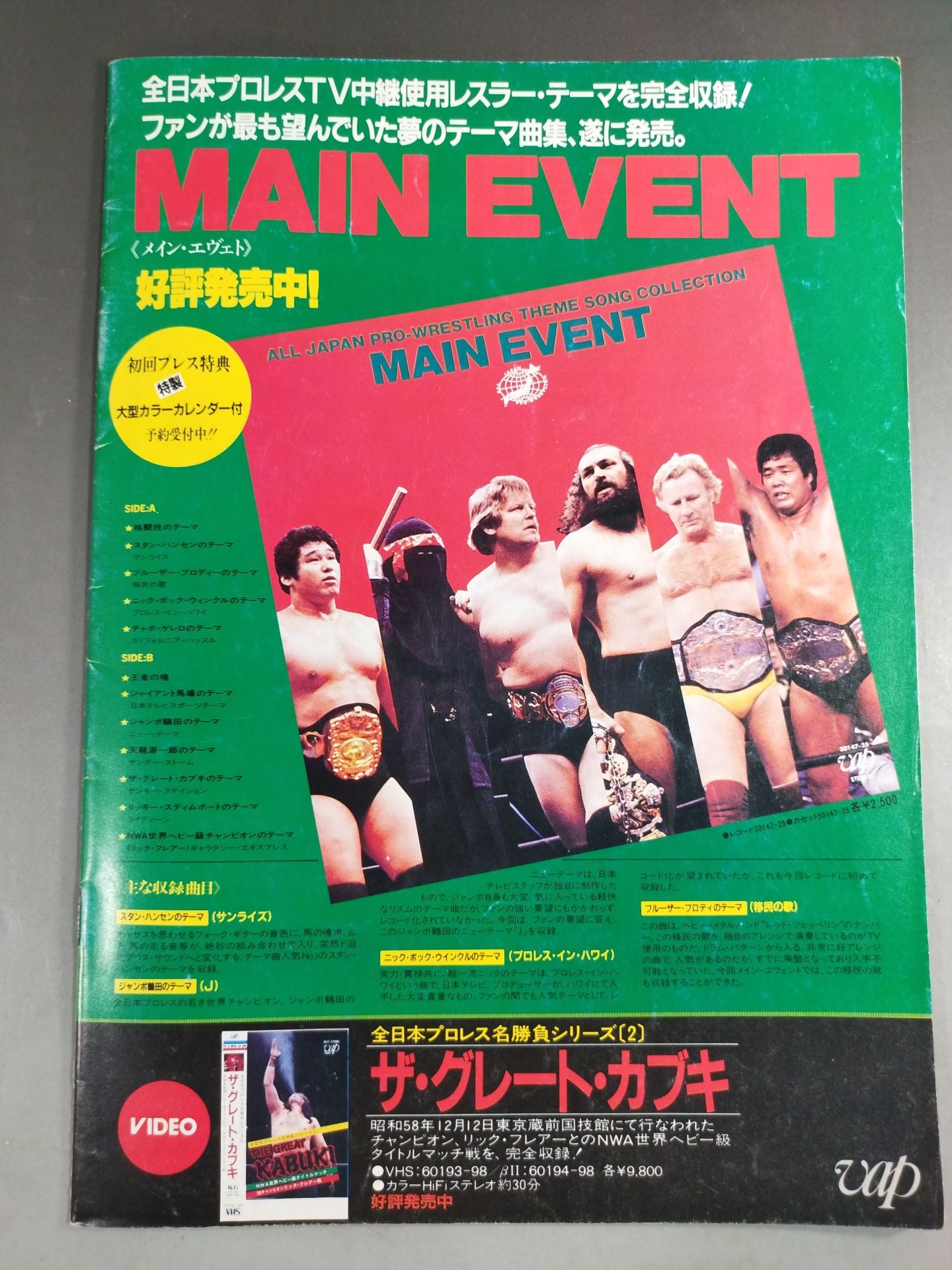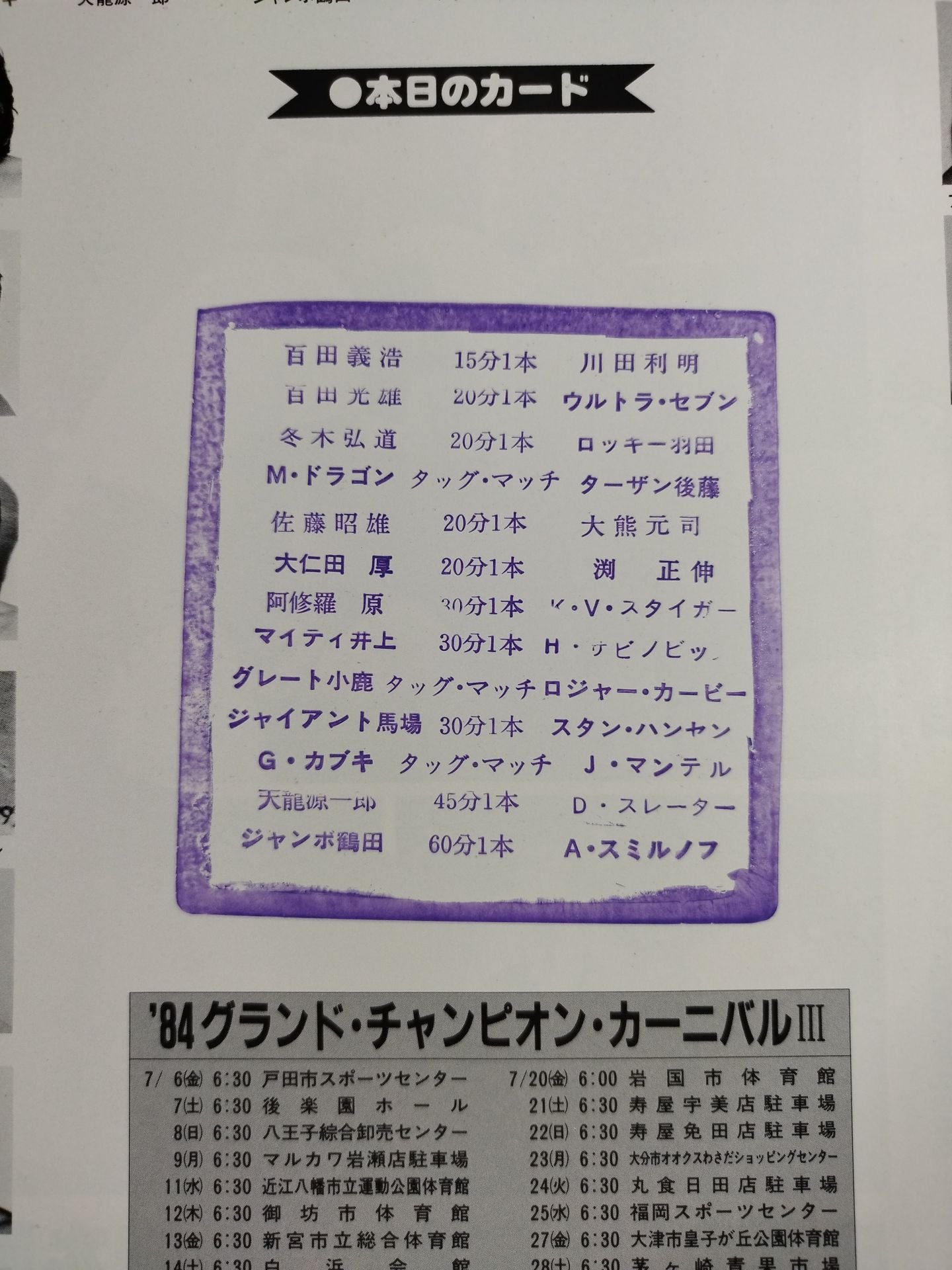 1984 Venue: Tamashima Gymnasium, Kurashiki, Okayama / stamped with list of matches : Jumbo Tsuruta vs Alex Smirnov / The Great Kabuki &Tenryu Genichiro vs Dick Rubbing Cuter & Johnny Mantell