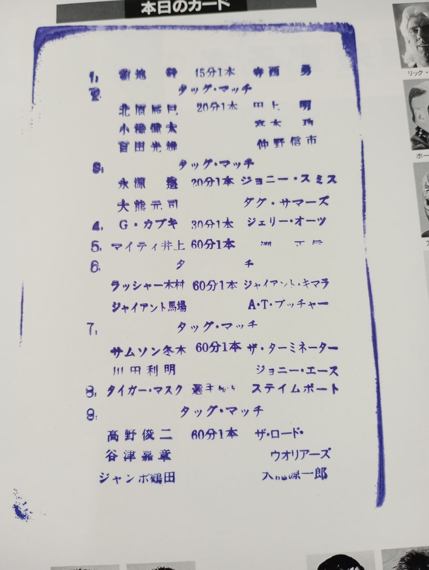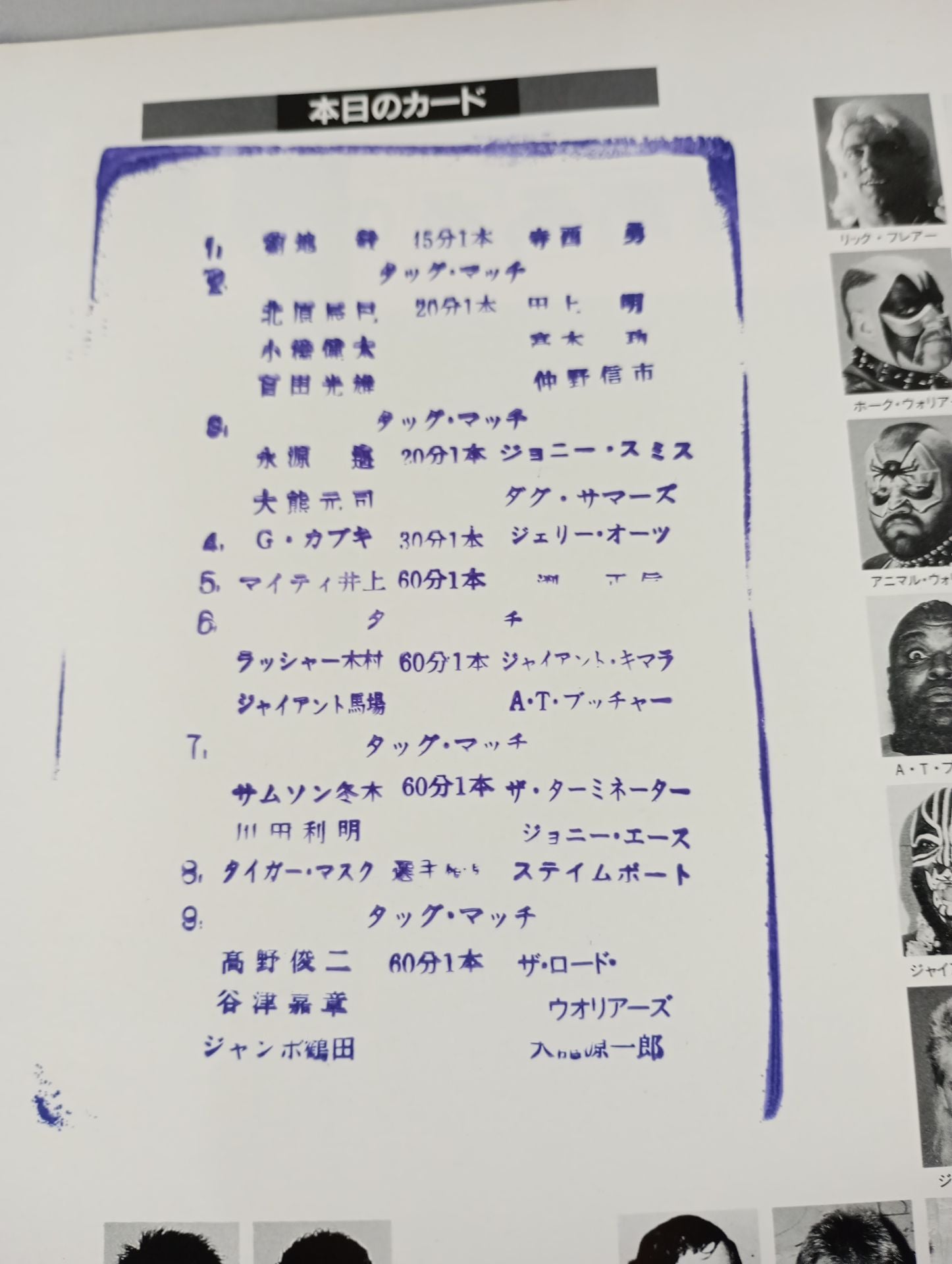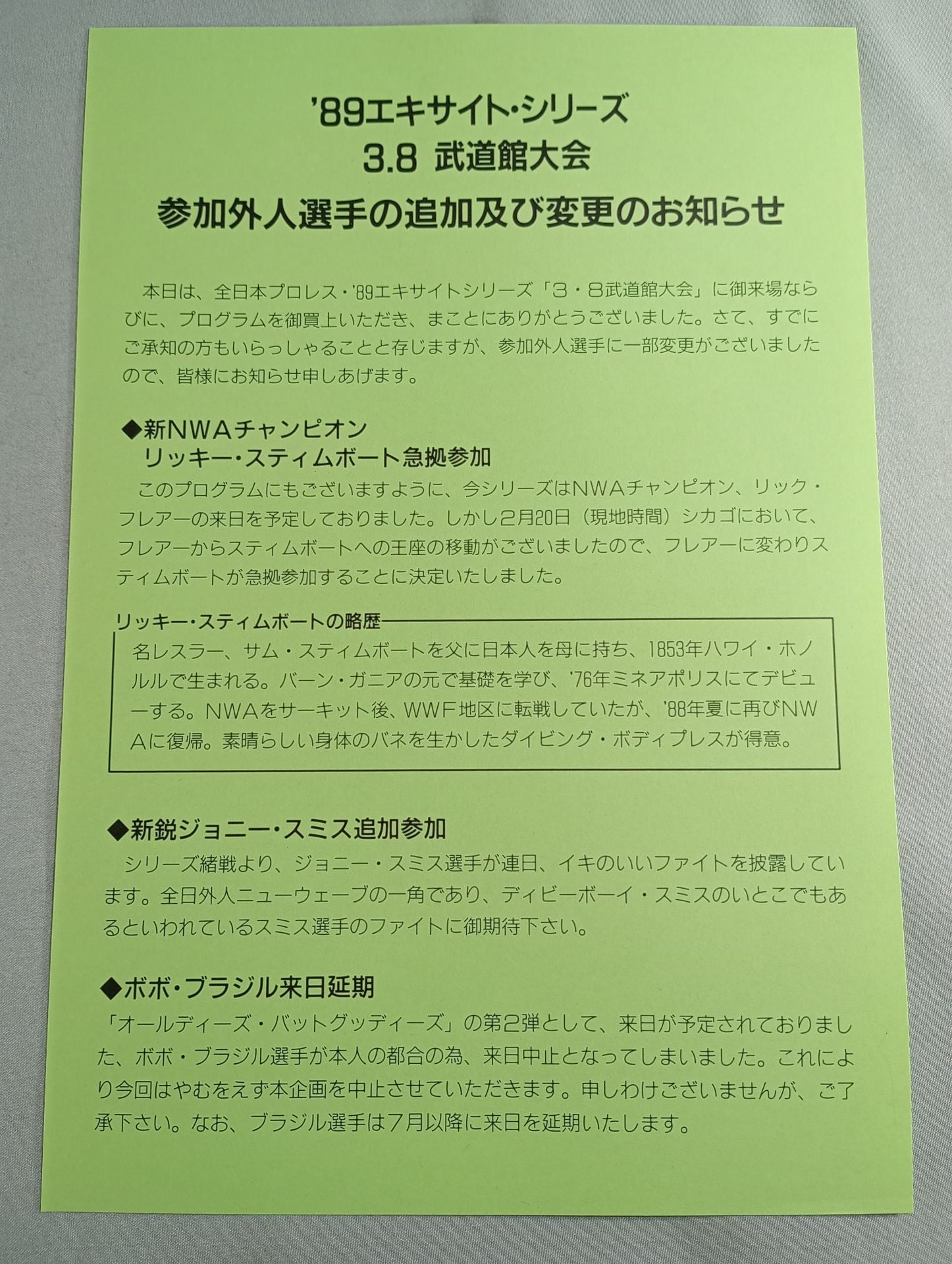 1989 Venue: Japan Budokan (Final Match) / Stamped with List of Matches : Jumbo Tsuruta & Yoshiaki Yatsu & Shunji Takano vs Tenryu Genichiro & Animal Warrior / Hawk Warrior / [NWA World Heavyweight Fighters Rights Match] Tiger Mask vs Ricky Steamboat 3.8 Budokan Roar!!