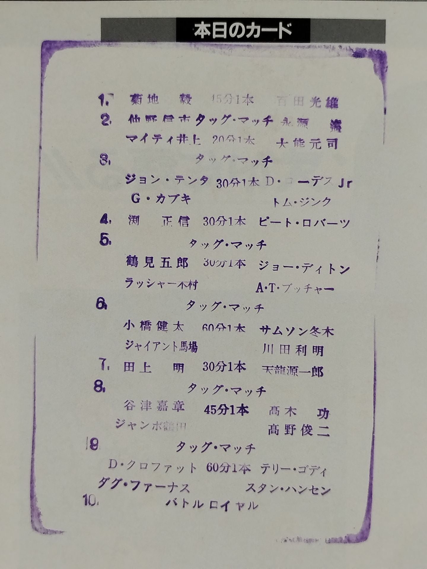 1989 Venue: Korakuen Hall / Stamped with list of matches : [Heavyweight Battle Royal] 21 participants / Doug Furnas & Dan Kroffat (Danny Kroffat) vs Stan Hansen & Terry Gordy