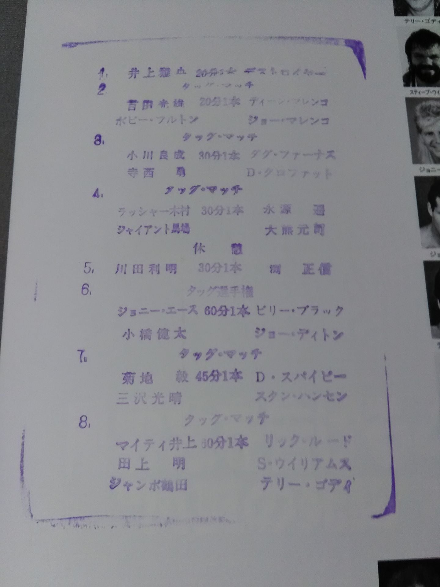 1991 Venue: Korakuen Hall / stamped with list of matches : Jumbo Tsuruta & Akira Taue& Mighty Inoue vs Terry Gordy > Steve Williams & Rick Ruud / Mitsuharu Misawa & Tsuyoshi Kikuchi vs Stan Hansen & Dan Spivey (Danny Spivey)