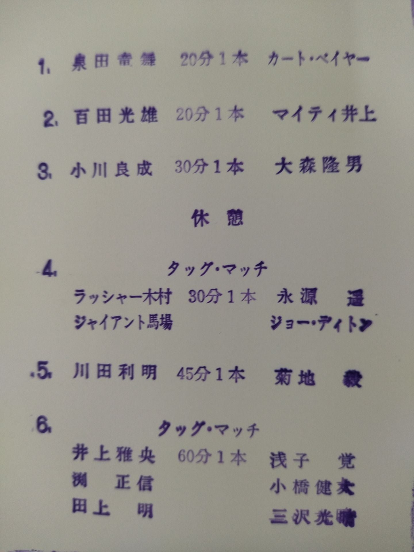 1993 Venue: Korakuen Hall / stamped with list of matches :Akira Taue & Masanobu Fuchi & Masao Inoue vs Mitsuharu Misawa & Kenta Kobashi& Satoru Asako Series Eve Festival, Weekly Pro Wrestling 10th Anniversary Baseball Magazine