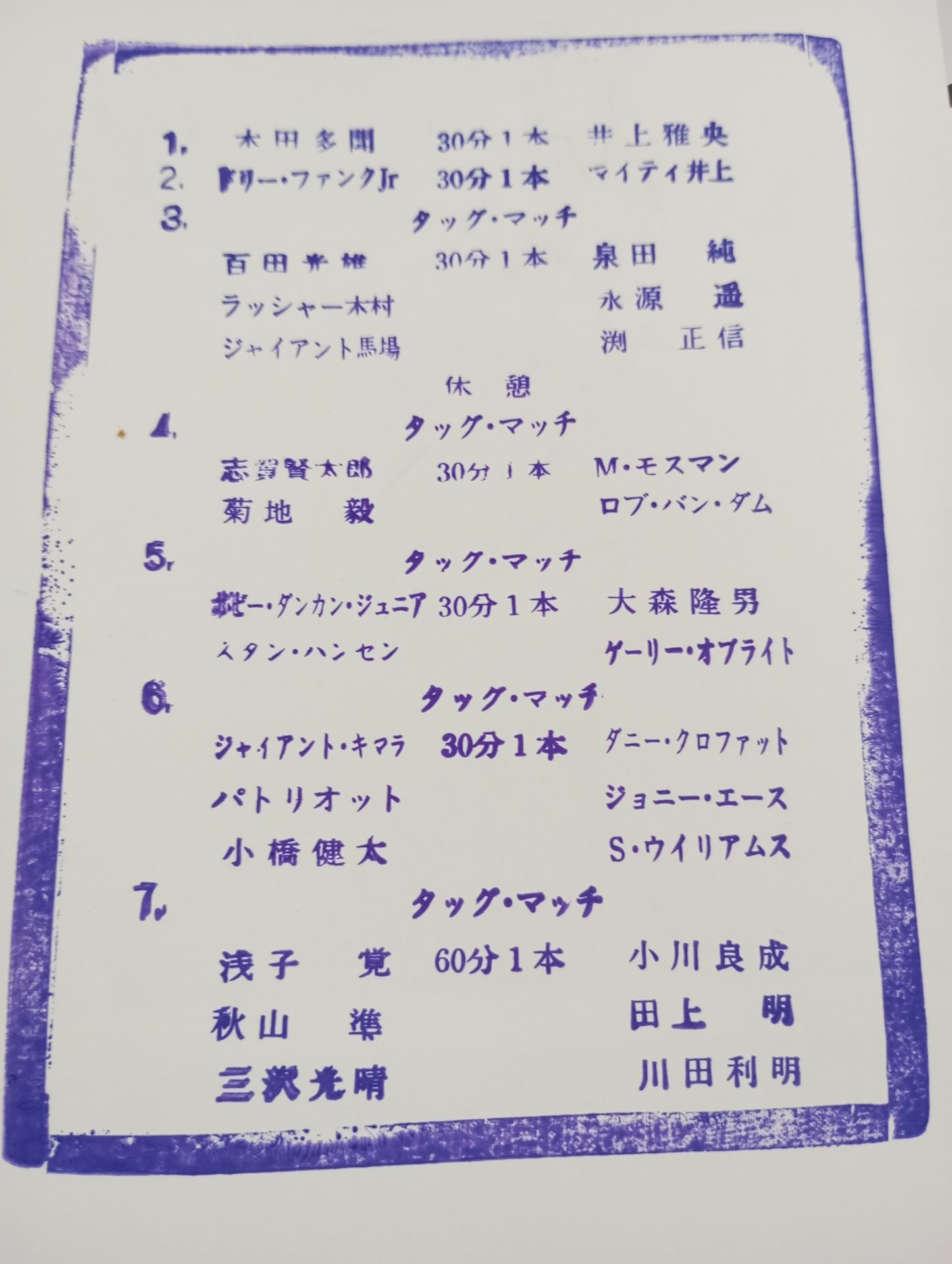 1996 Venue: Korakuen Hall (season opener) / stamped with list of matches :Mitsuharu Misawa& Jun Akiyama & Satoru Asako vs Toshiaki Kawada & Akira Taue & Yoshinari Ogawa