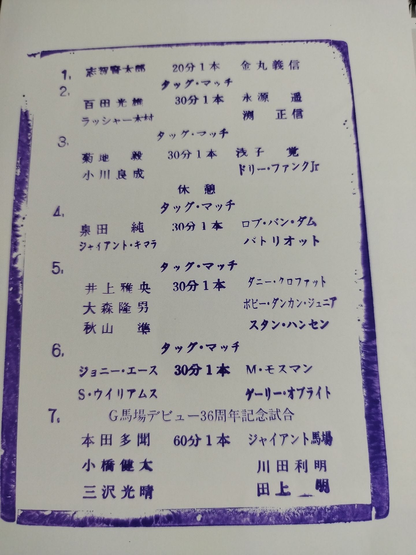 1996 Venue: Korakuen Hall / stamped with list of matches : [G Baba debut 36th anniversary match] Mitsuharu Misawa & Kenta Kobashi & Tamon Honda vs Akira Taue & Toshiaki Kawada & Giant Baba