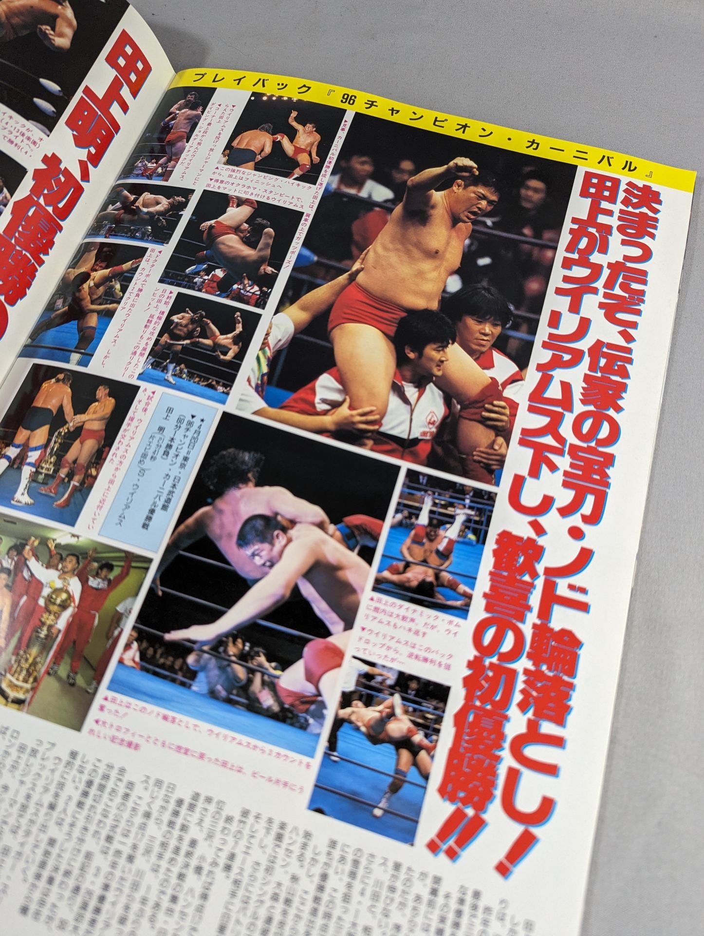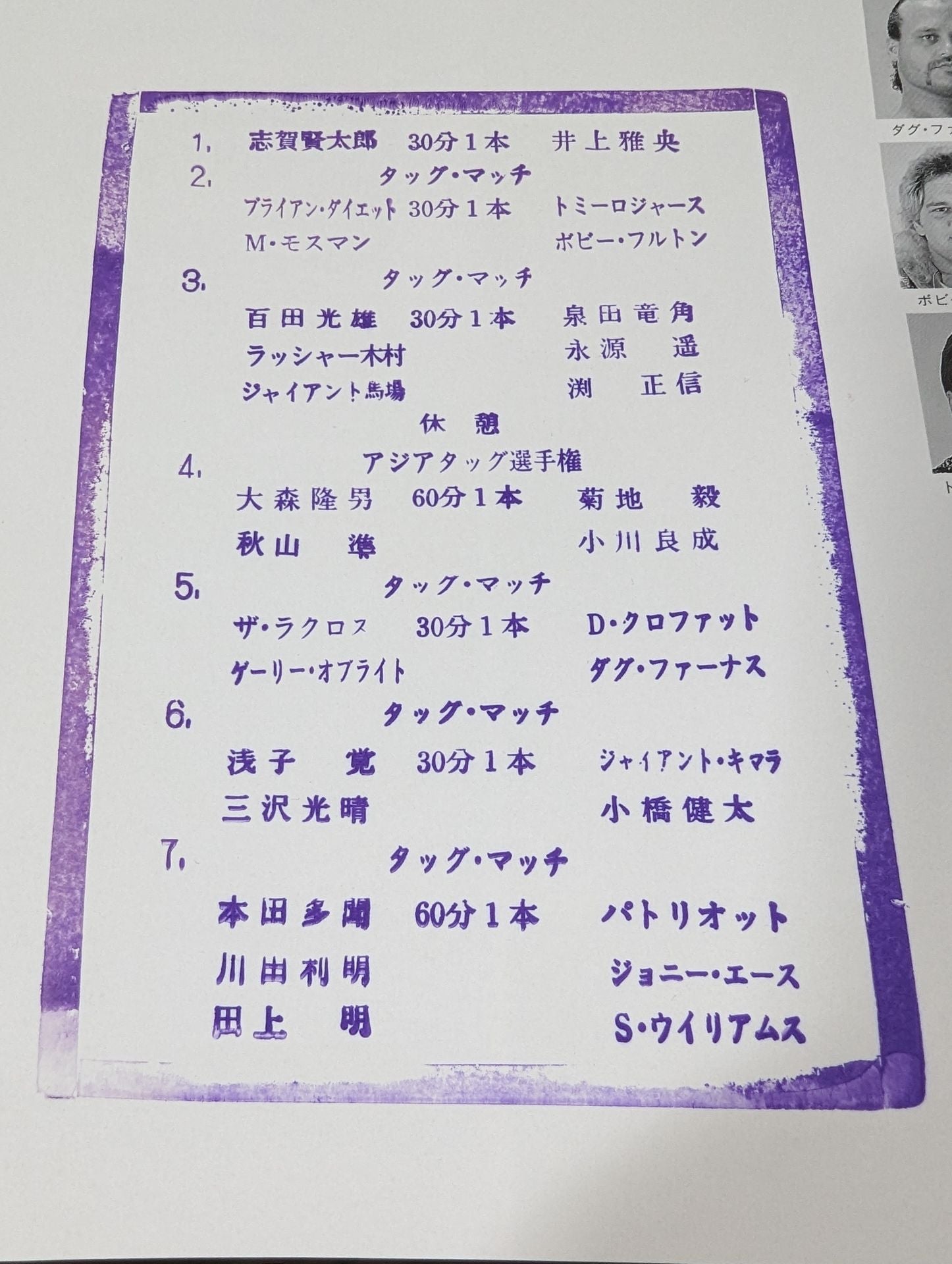 1996 Venue: Kawagoe Municipal Gymnasium, Saitama / stamped with list of matches : Akira Taue & Toshiaki Kawada & Tamon Honda vs Steve Williams & Johnny Ace & Patriot