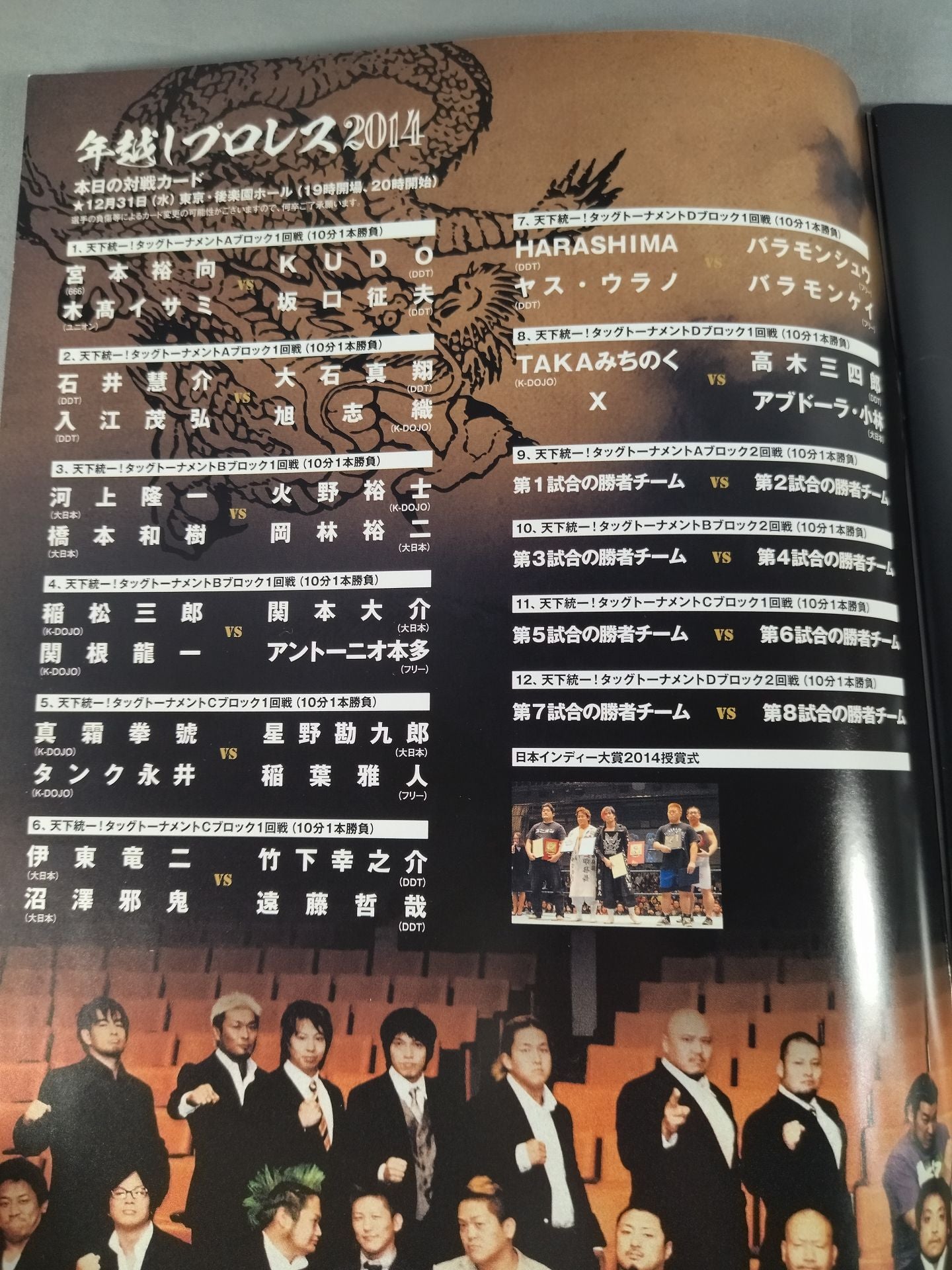 2014 Venue: Korakuen Hall / List of the matches is printed: [Tag Team Tournament Finals] Winner of Match 7 vs Winner of Match 8 (Yuko Miyamoto &Isami Kodaka vsYuji Hino & Yuji Okabayashi ) / Japan Indie Awards Ceremony