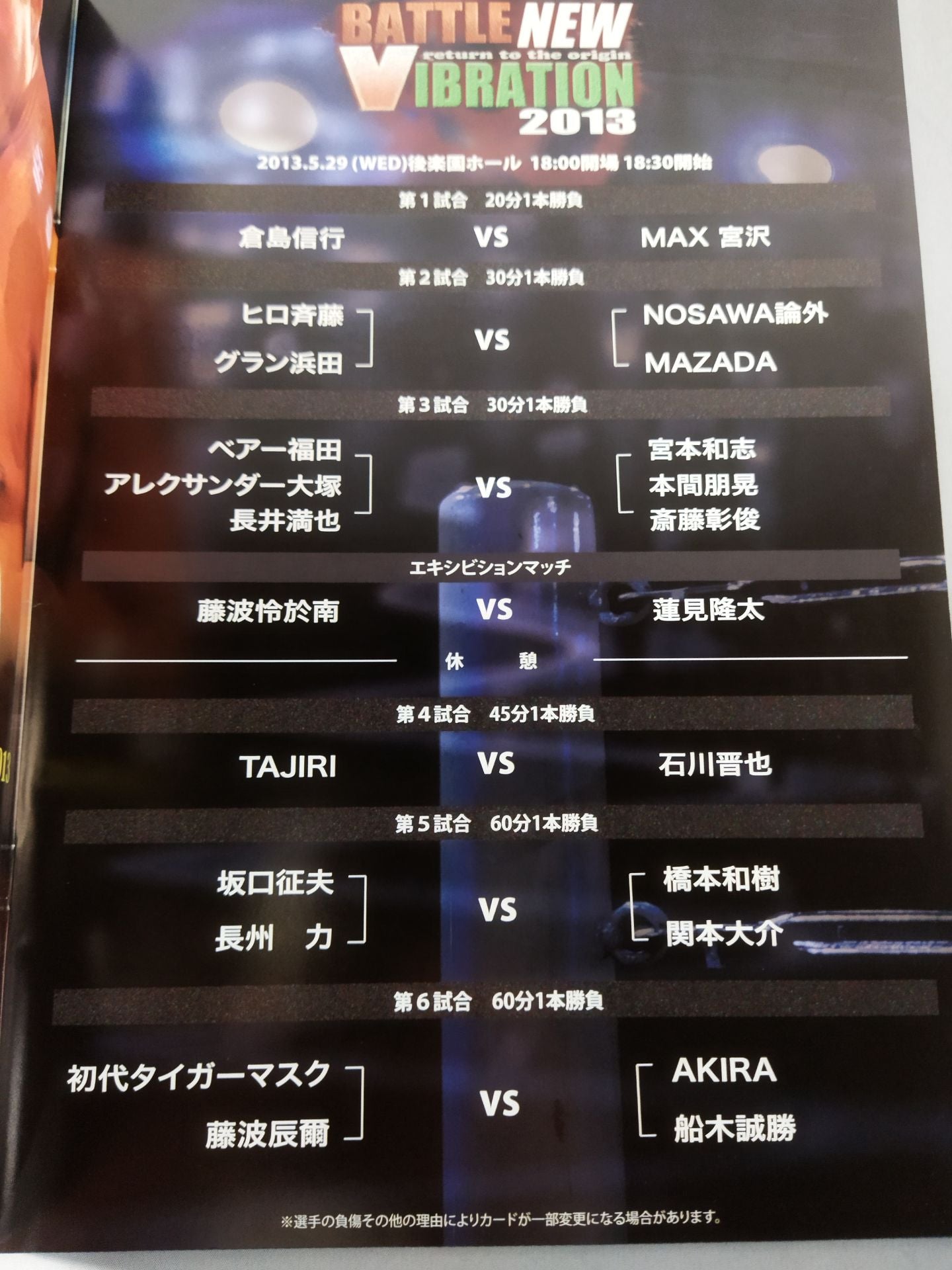 Venue: Korakuen Hall / list of the matches is printed : The first Tiger Mask & Tatsumi Fujinami vs AKIRA & Masakatsu Funaki / A4 size [LEONA Pre-Debut Match/Exhibition Match] Reinan Fujinami (LEONA) vs Ryuta Hasumi DRADITION / Battle New Vibration 2013