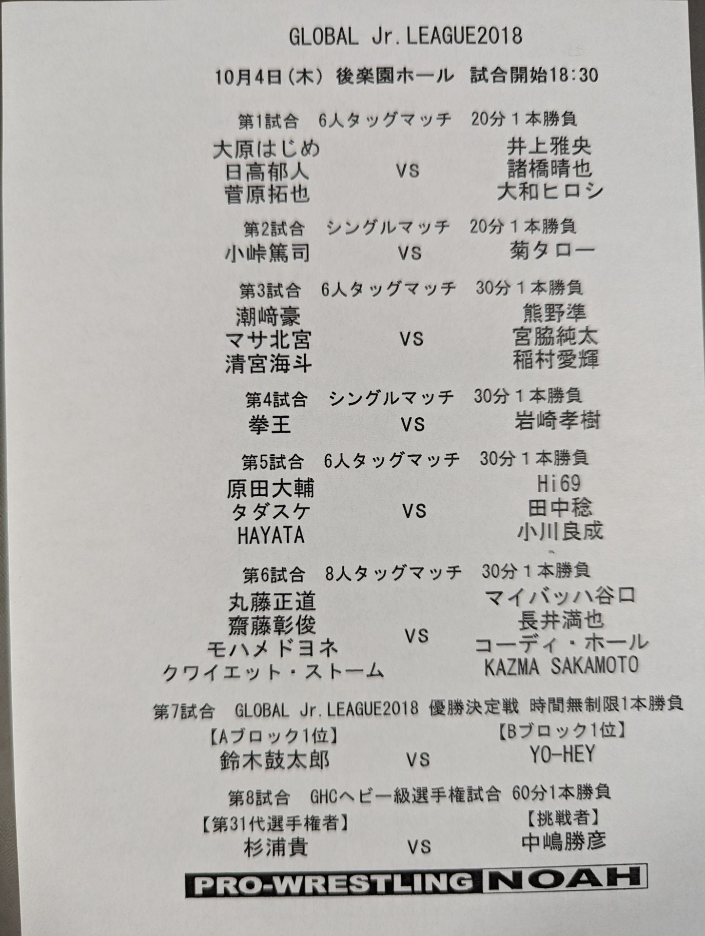 2018 Venue: Korakuen Hall (Final Round) / list of the matches on the separate sheet : [GHC Heavyweight Fighters Right] Takashi Sugiura vs Katsuhiko Nakajima / [GLOBAL Jr. LEAGUE Championship] Kotaro Suzuki vs. YO-HEY GLOBAL Jr. LEAGUE 2018