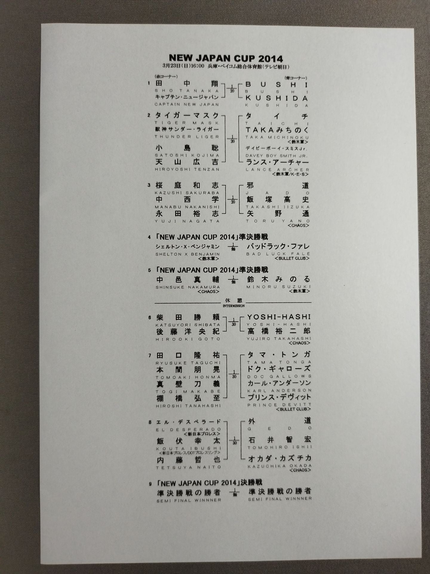 2014 Venue: Baycom General Gymnasium, Hyogo (Final Match) / list of the matches on the separate sheet : [NEW JAPAN CUP2014 Finals] Winner of the semi-final match vs winner of the semi-final match (Shinsuke Nakamura vs Butrak Fale) / Tetsuya Naito & Kota Ibushi& El Desperado vs Kazuchika Okada & Tomohiro Ishii & GEDO Flag Raising Anniversary / Flag Raising Anniversary / NEW JAPAN CUP 2014
