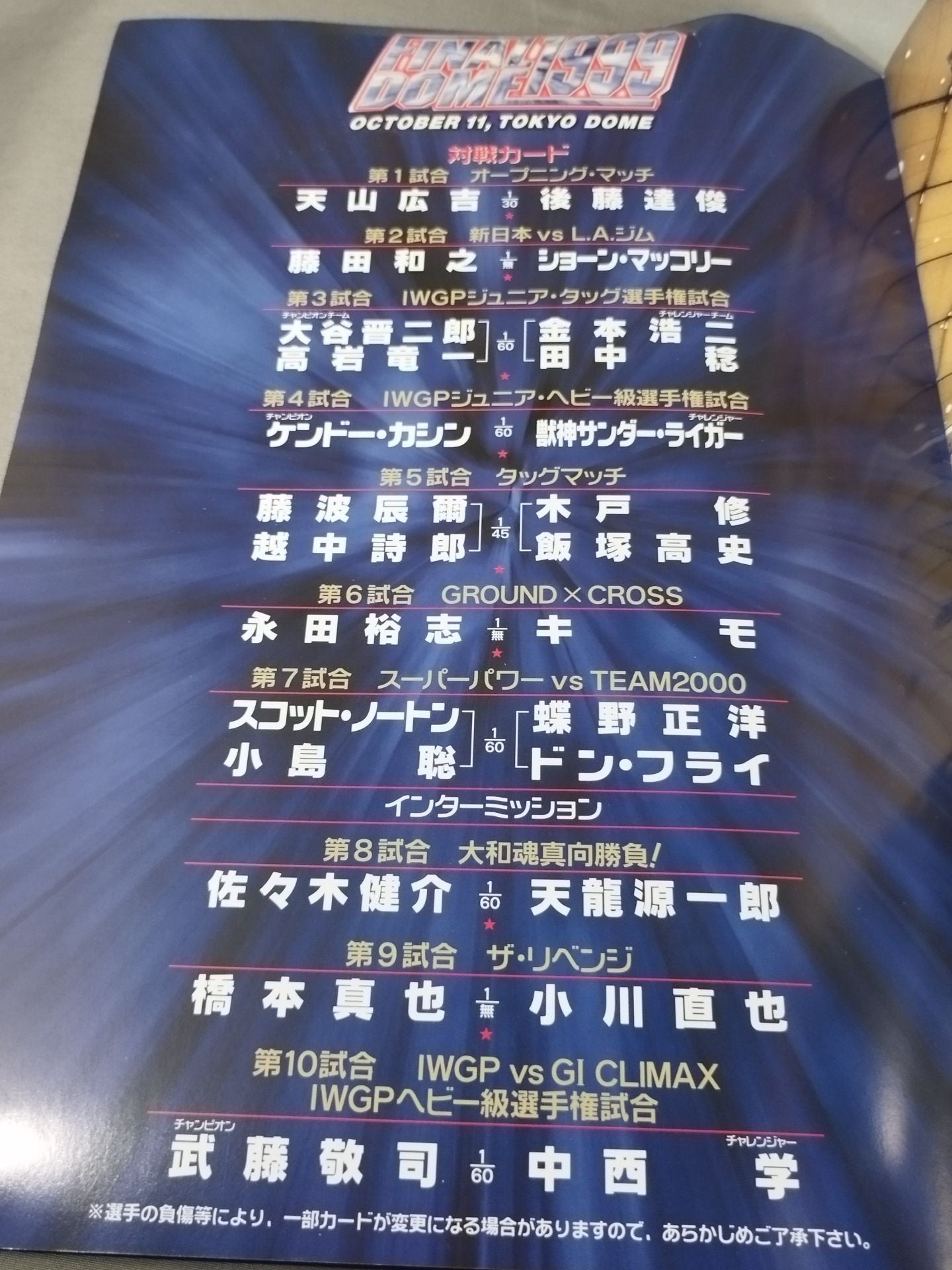 1999 Venue: Tokyo Dome / List of the matches is printed : 【NWA World HeavyweightFighters Rights Match] Shinya Hashimoto vs Naoya Ogawa / [IWGP HeavyweightFighters right match] Muto Keiji vs Manabu Nakanishi / Kensuke Sasaki vs Tenryu Genichiro