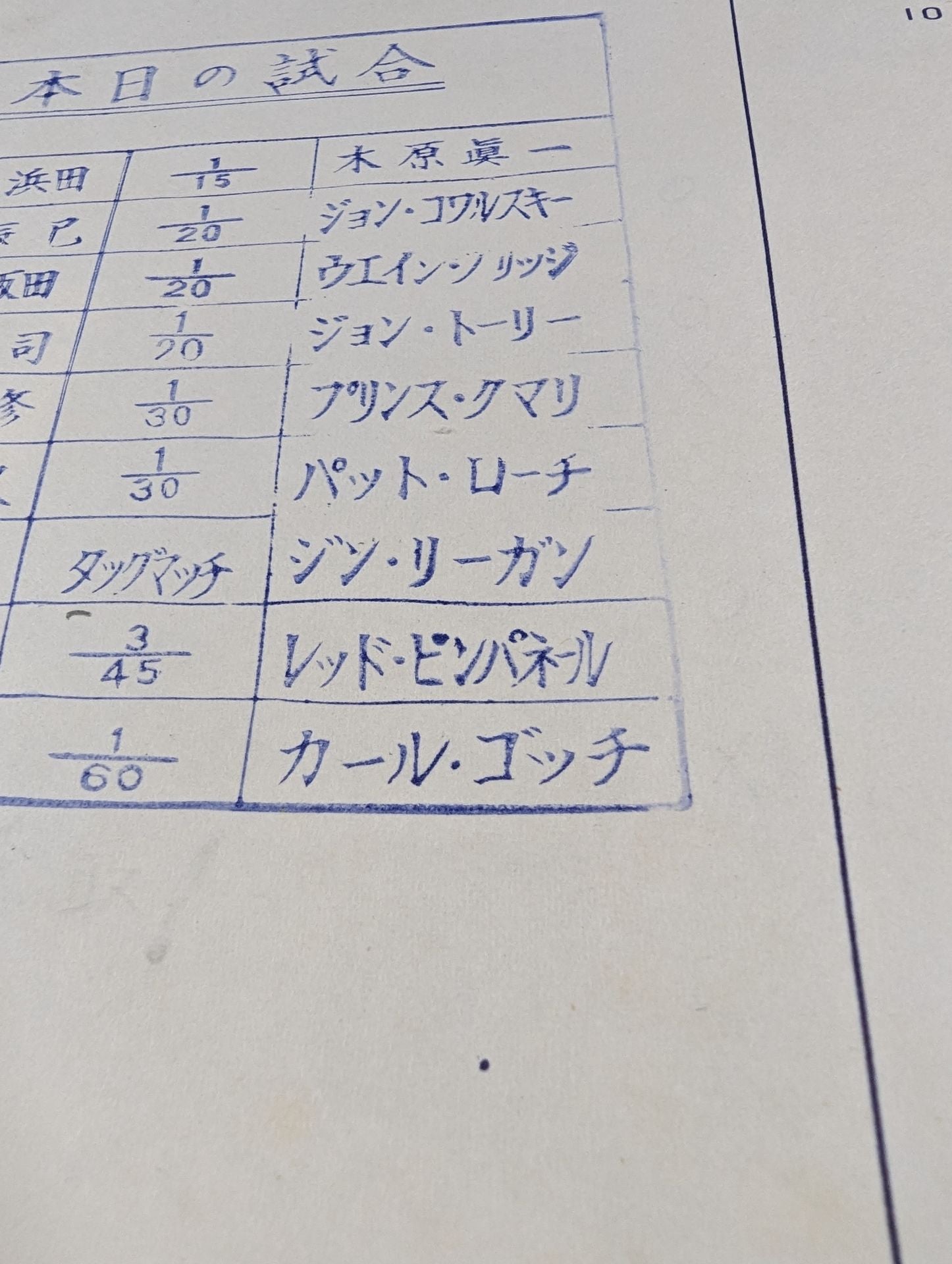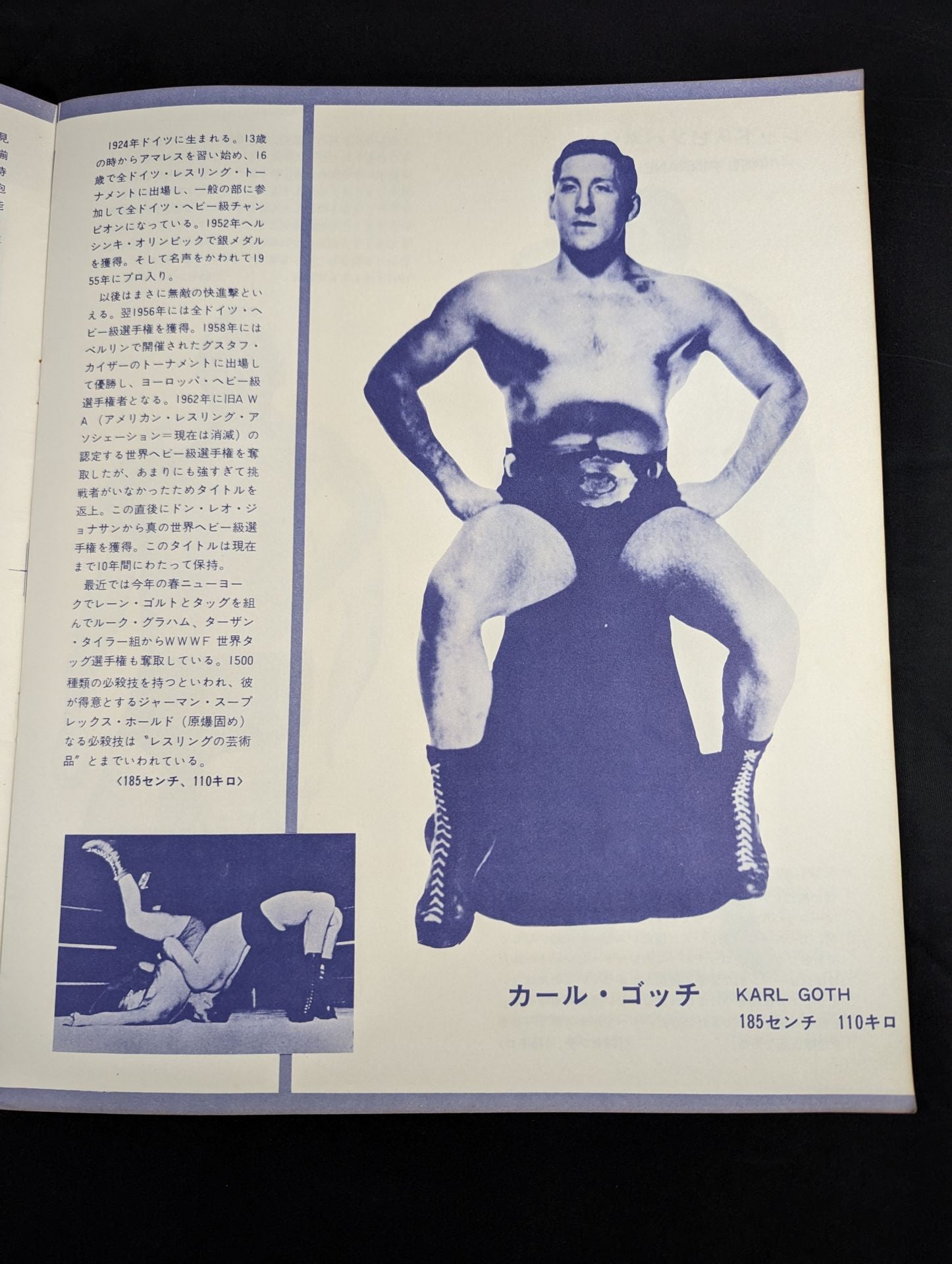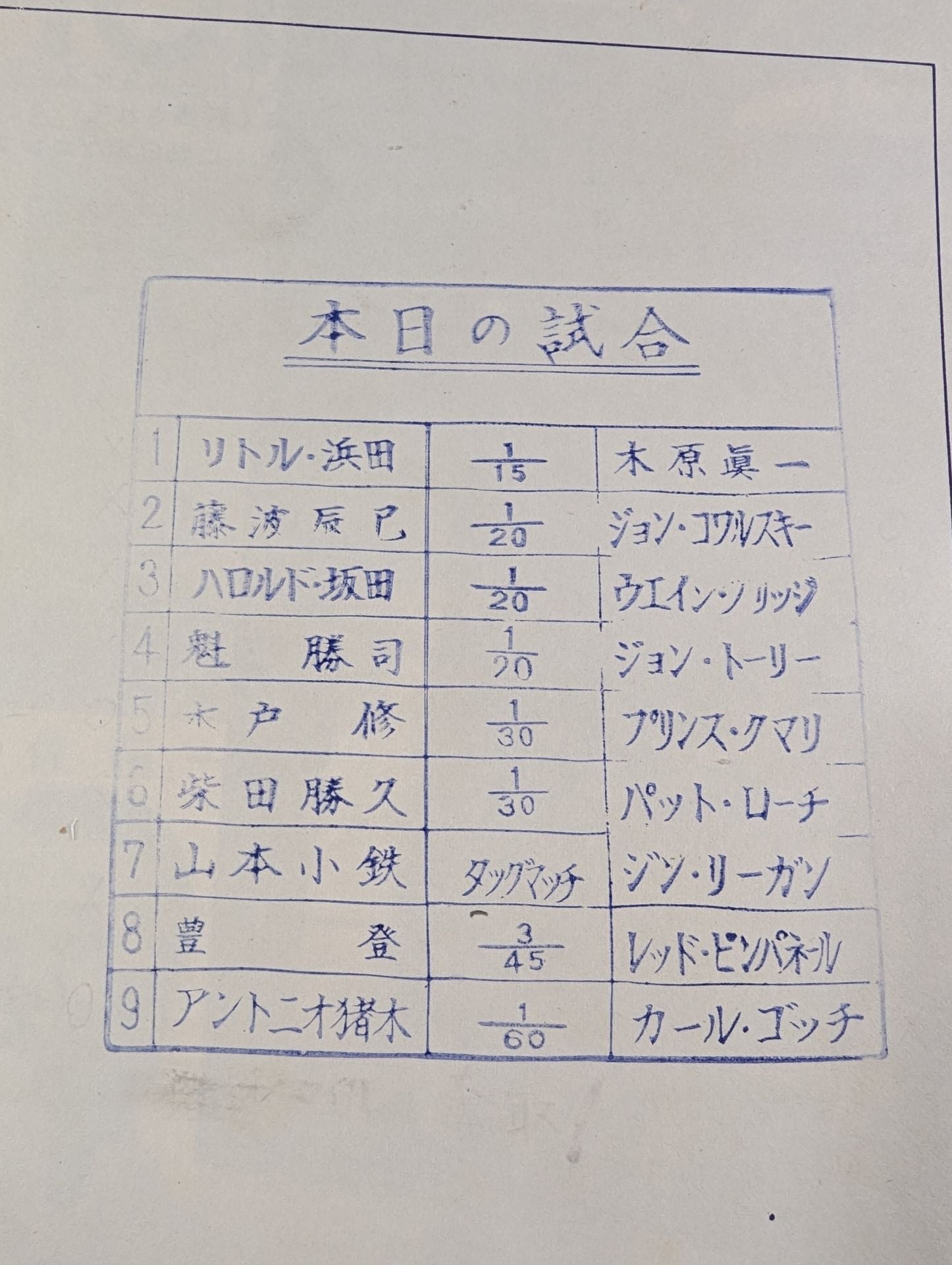 1972 The True World Heavyweight Title is held by Karl Gotch , who does not fall under NWA, AWA, NWF, or WWWF. With this belt at stake, the lord Antonio Inoki of One Country, One Castle, who is breaking away from the "Young Lion", and the god Karl Gotch , the refereeWelcomed by Lou Thesz , they clashed with their first single in 6 months since the First Show ! Despite the fact that the telecast has not yet begun, A legendary match that was watched by the public and broadcast on Tokyo 12 Channel! Venue: Kuramae Kokugikan / stamped with list of matches: [True World Heavyweight Title fighters Match] Antonio Inoki vsKarl Gotch / Toyonobori & Kotetsu Yamamotovs Red Pimpannere & Jin Regan / Katsuhisa Shibata vs Pat Roach
