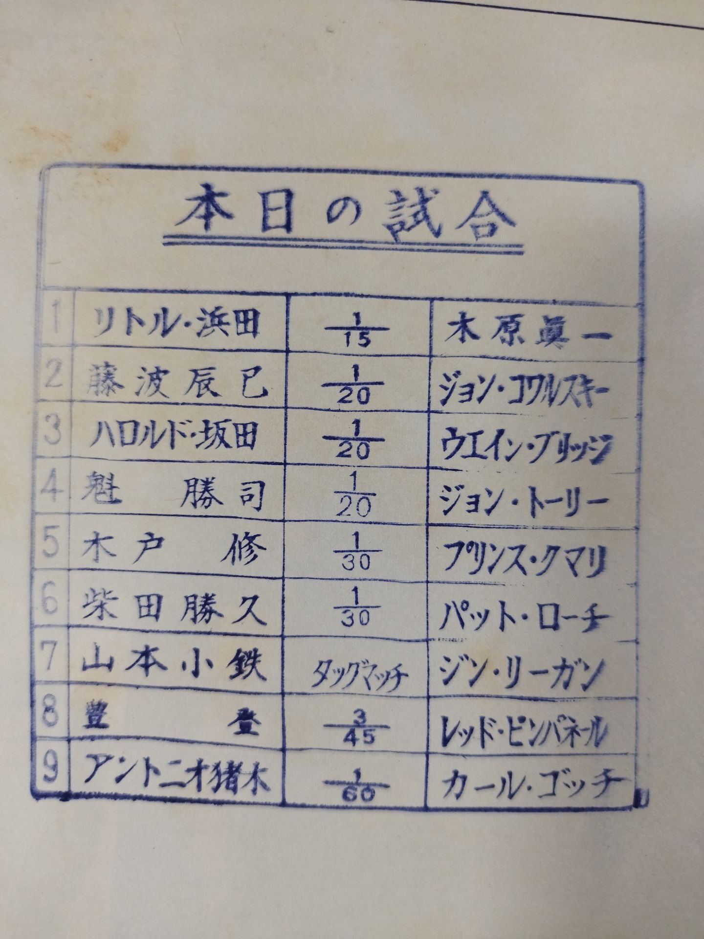 1972 The True World Heavyweight Title is held by Karl Gotch , who does not fall under NWA, AWA, NWF, or WWWF. With this belt at stake, the lord Antonio Inoki of One Country, One Castle, who is breaking away from the "Young Lion", and the god Karl Gotch , the refereeWelcomed by Lou Thesz , they clashed with their first single in 6 months since the First Show ! Despite the fact that the telecast has not yet begun, A legendary match that was watched by the public and broadcast on Tokyo 12 Channel! Venue: Kuramae Kokugikan / stamped with list of matches: [True World Heavyweight Title fighters Match] Antonio Inoki vsKarl Gotch / Toyonobori & Kotetsu Yamamotovs Red Pimpannere & Jin Regan / Katsuhisa Shibata vs Pat Roach
