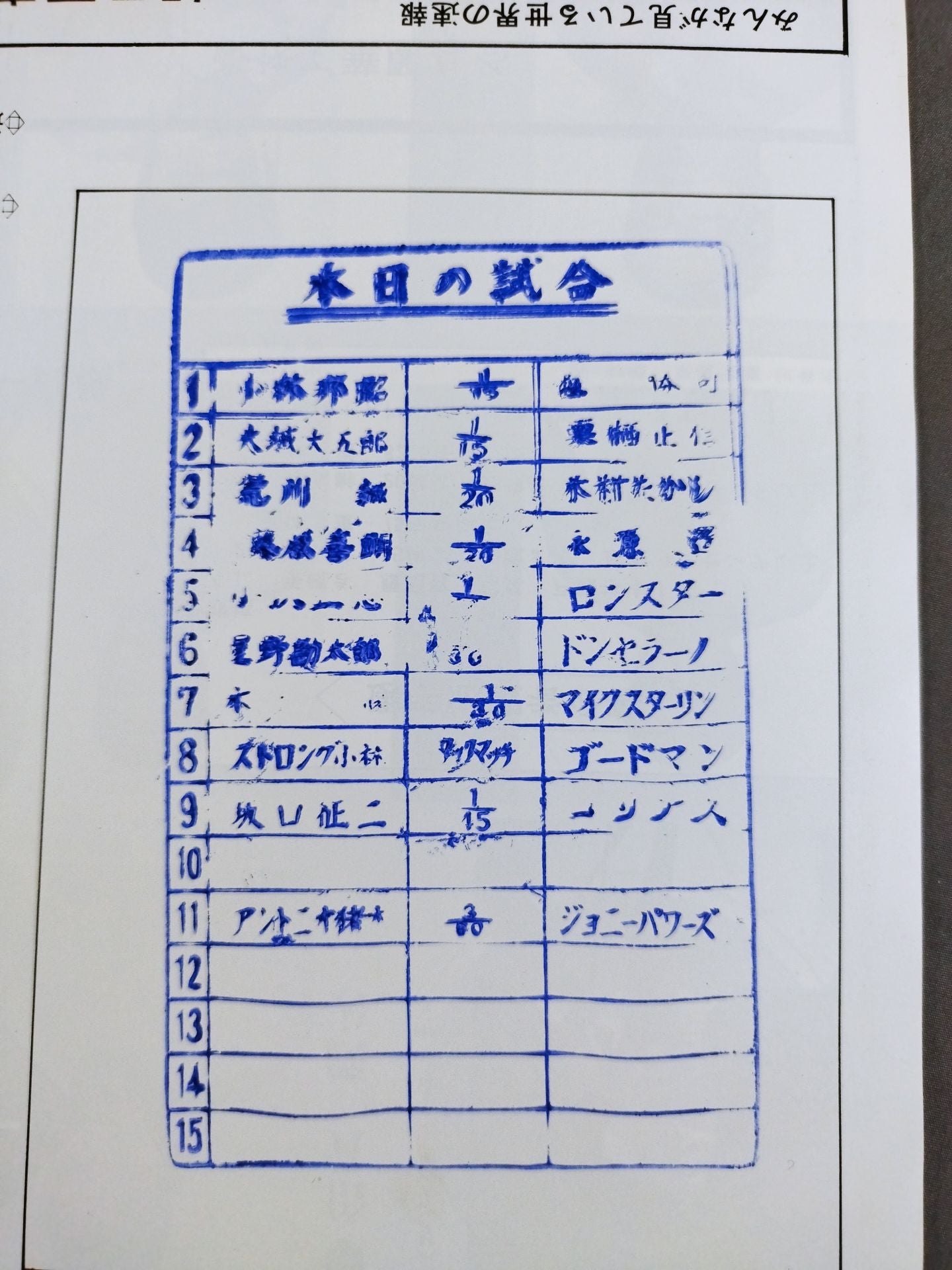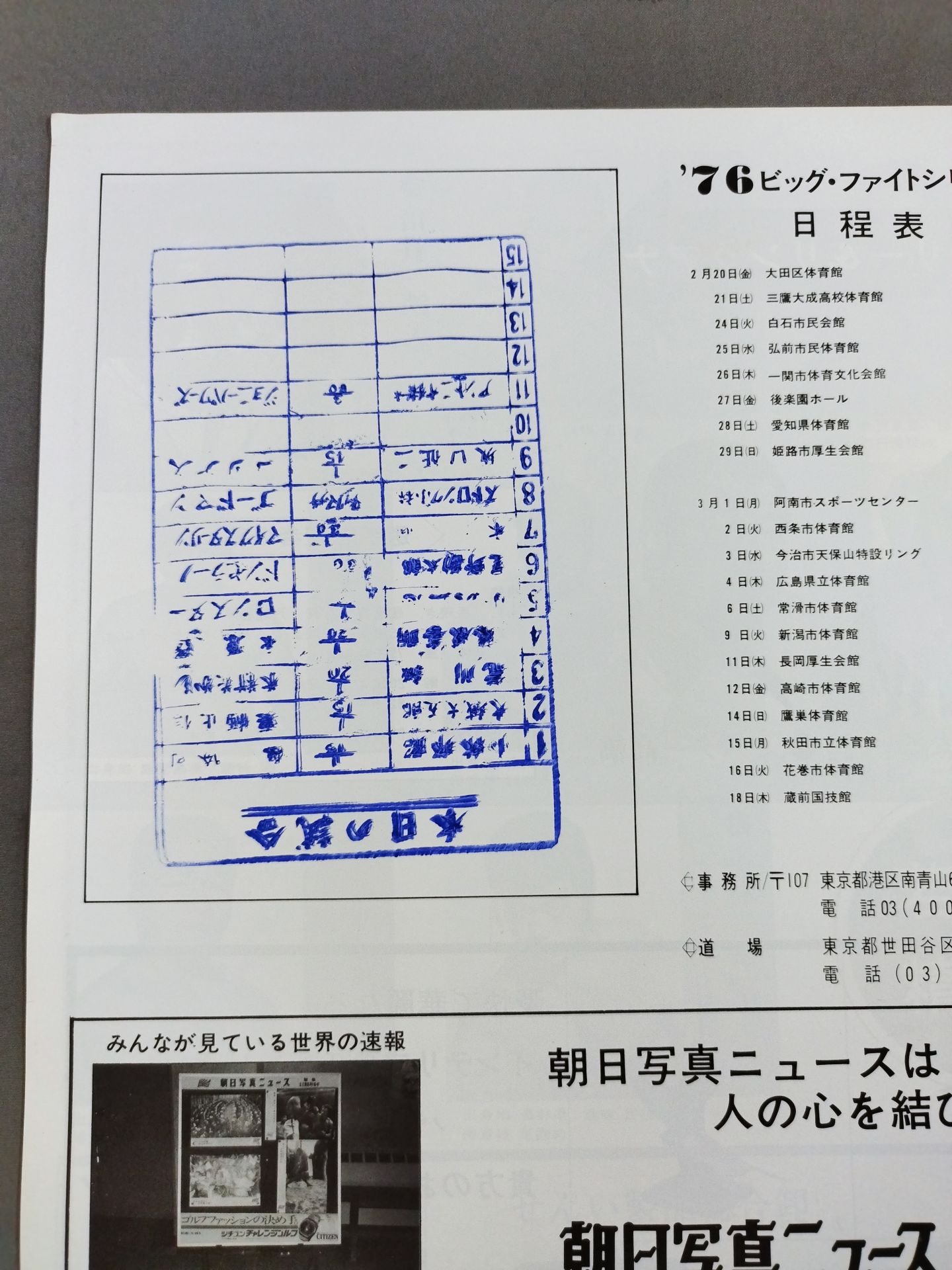 1976 Venue; Kuramae Kokugikan (Final Round) / stamped with list of matches: [NWF World Heavyweight fighters Rights Match] Antonio Inoki vs Johnny Powers / Seiji Sakaguchi & Strong Kobayashi vs El Goliath & Black Goldman