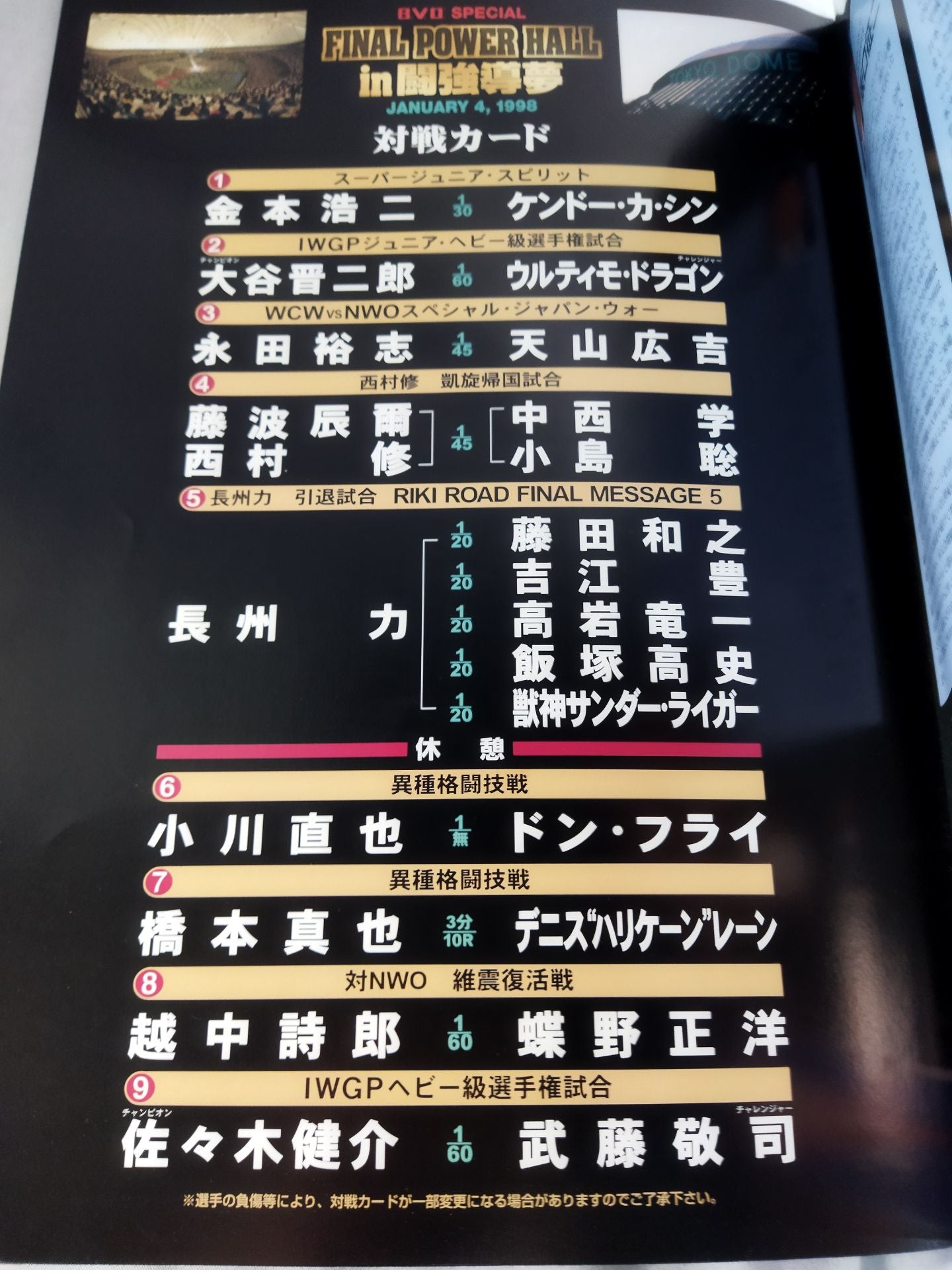 1998 Venue: Tokyo Dome / List of the matches is printed : IWGP HeavyweightFighters rights match] Kensuke Sasaki vs Muto Keiji / Naoya Ogawa vsDon Frye / [Riki Choshu Retirement Match, 5-seater] Riki Choshu vs Kazuyuki Fujita& Yutaka Yoshie & Tatsuhito Takaiwa & Takashi Iizuka & Jushin Thunder Liger Final Power Hole