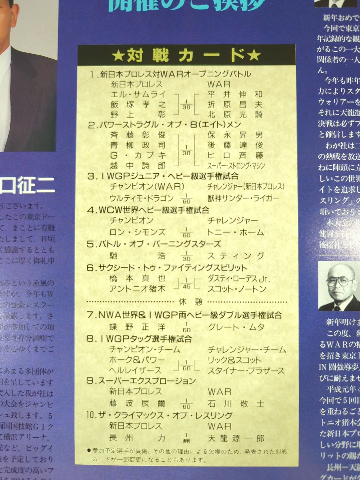 1993 Venue: Tokyo Dome / List of the matches is printed : Riki Choshu vs Tenryu Genichiro / [IWGP Tag Team fighters Hell Razors (Hawk & Power) vs Steiner Brothers (Rick & Scott) / [NWA World & IWGP Heavyweight Double Fighters Rights Match] Masahiro Chono vs Great Muta / Hiroshi Hase vsSting