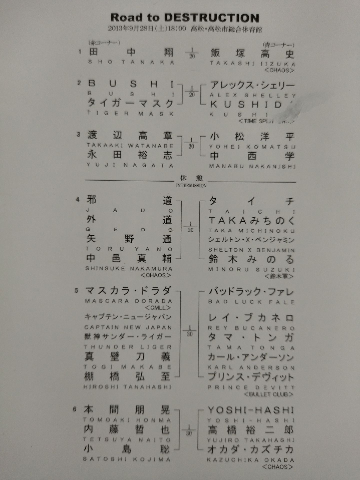 2013 Venue: Kagawa Takamatsu City General Gymnasium / List of the matches on the separate sheet : Satoshi Kojima & Tetsuya Naito & Tomoaki Honma vs Kazuchika Okada&高橋裕二郎&YOSHI-HASHI Road to DESTRUCTION