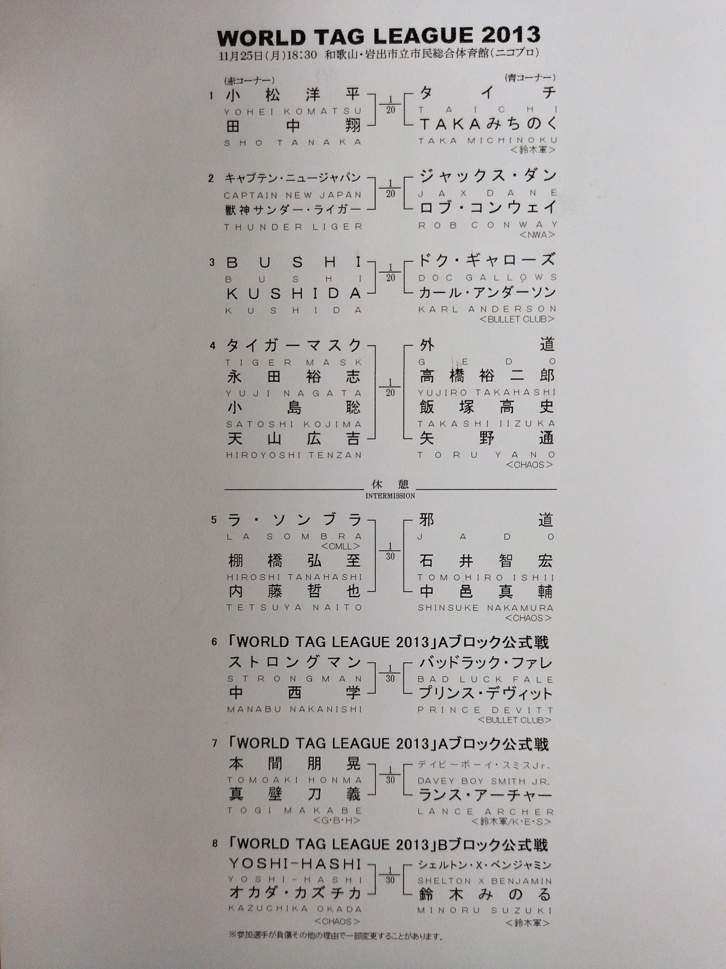 2013 Venue: Iwade City Gymnasium, Wakayama / list of the matches on the separate sheet: [Official Match] YOSHI-HASHI & Kazuchika Okada vs Shelton X Benjamin & Minoru Suzuki WORLD TAG LEAGUE 2013 / World Tag League 2013