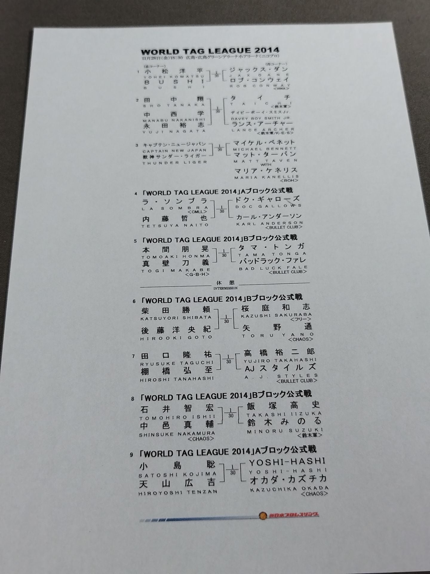 2014 Venue: Hiroshima Green Arena / List of the matches on the separate sheet : 【 Official Match] Hiroyoshi Tenzan & Satoshi Kojima vs Kazuchika Okada&YOSHI-HASHI / [Official Match] Shinsuke Nakamura & Tomohiro Ishii vs Minoru Suzuki & Takashi Iizuka WORLD TAG LEAGUE 2014