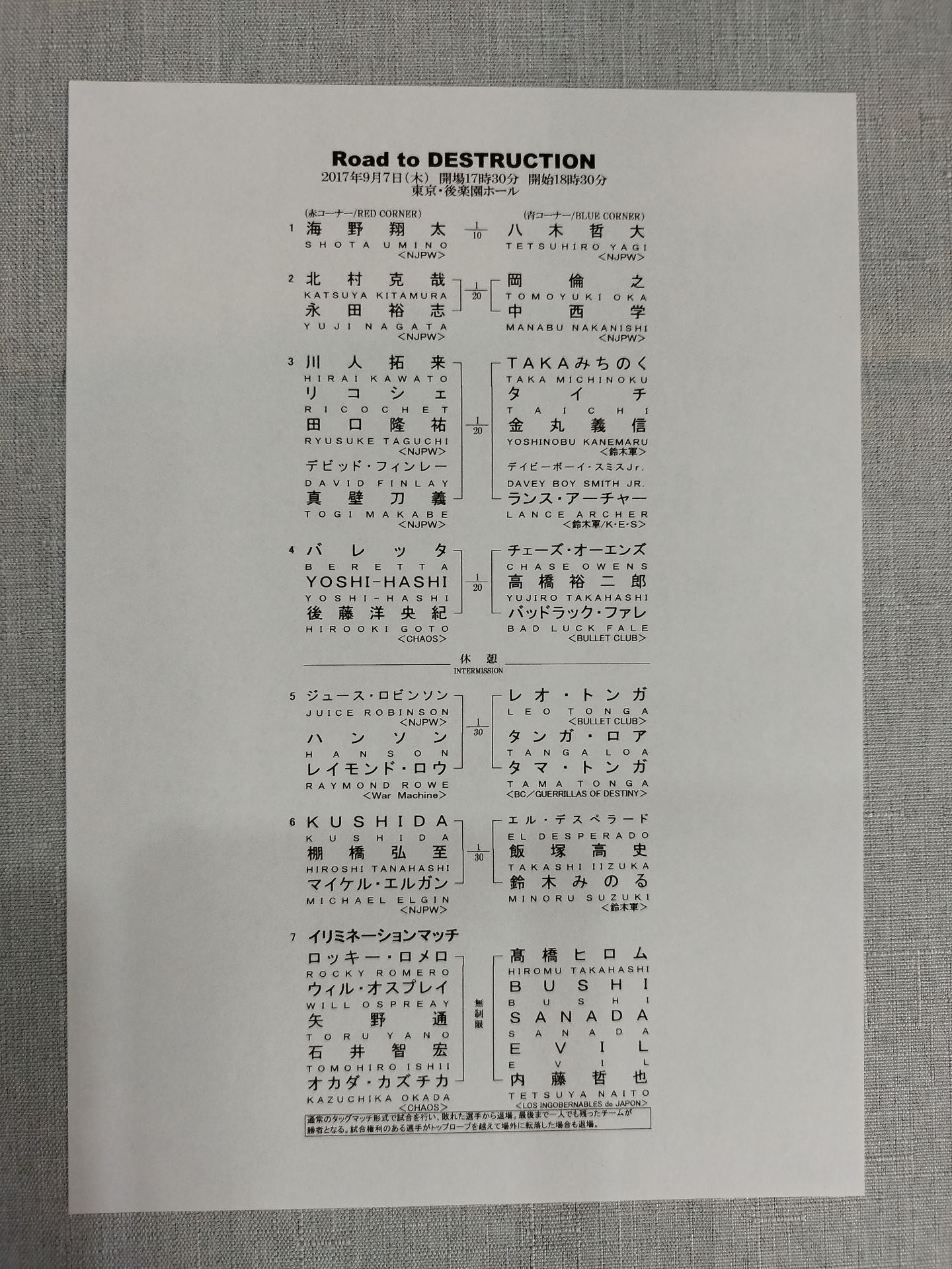 2017 Venue: Niigata, Shibata City Culture Center / list of the matches on the separate sheetWith: [Elimination Match] Tetsuya Naito & EVIL & SANADA & BUSHI & Hiromu Takahashi vs vsKazuchika Okada & Tomohiro Ishii & Toru Yano & Will Ospreay & Rocky Romero
