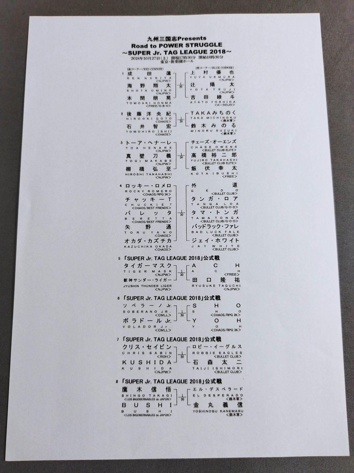 2018 Venue: Korakuen Hall / List of the matches on the separate sheet : [Super Junior Tag League Official Match] BUSHI & Shingo Takagi vs Yoshinobu Kanemaru&El Desperado Road to POWER STRUGGLE ~SUPER Jr. TAG LEAGUE 2018~