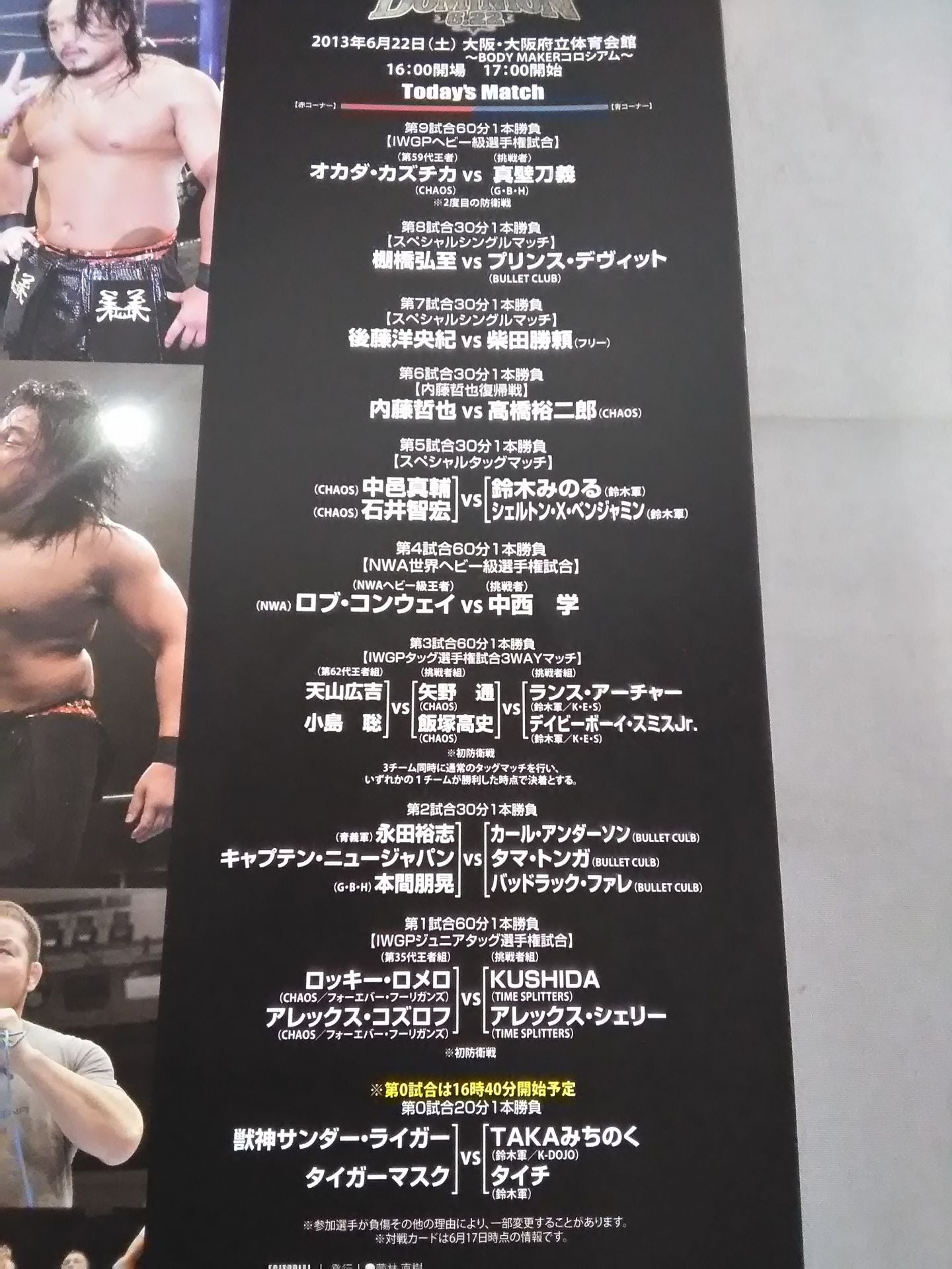 2013 Venue: Bodymaker Coliseum, Osaka / List of the matches is printed : IWGP HeavyweightFighters right match] Kazuchika Okada vs Togi Makabe / Hiroshi Tanahashi vs Prince Devitt / Hirooki Gotovs Katsuyori Shibata
