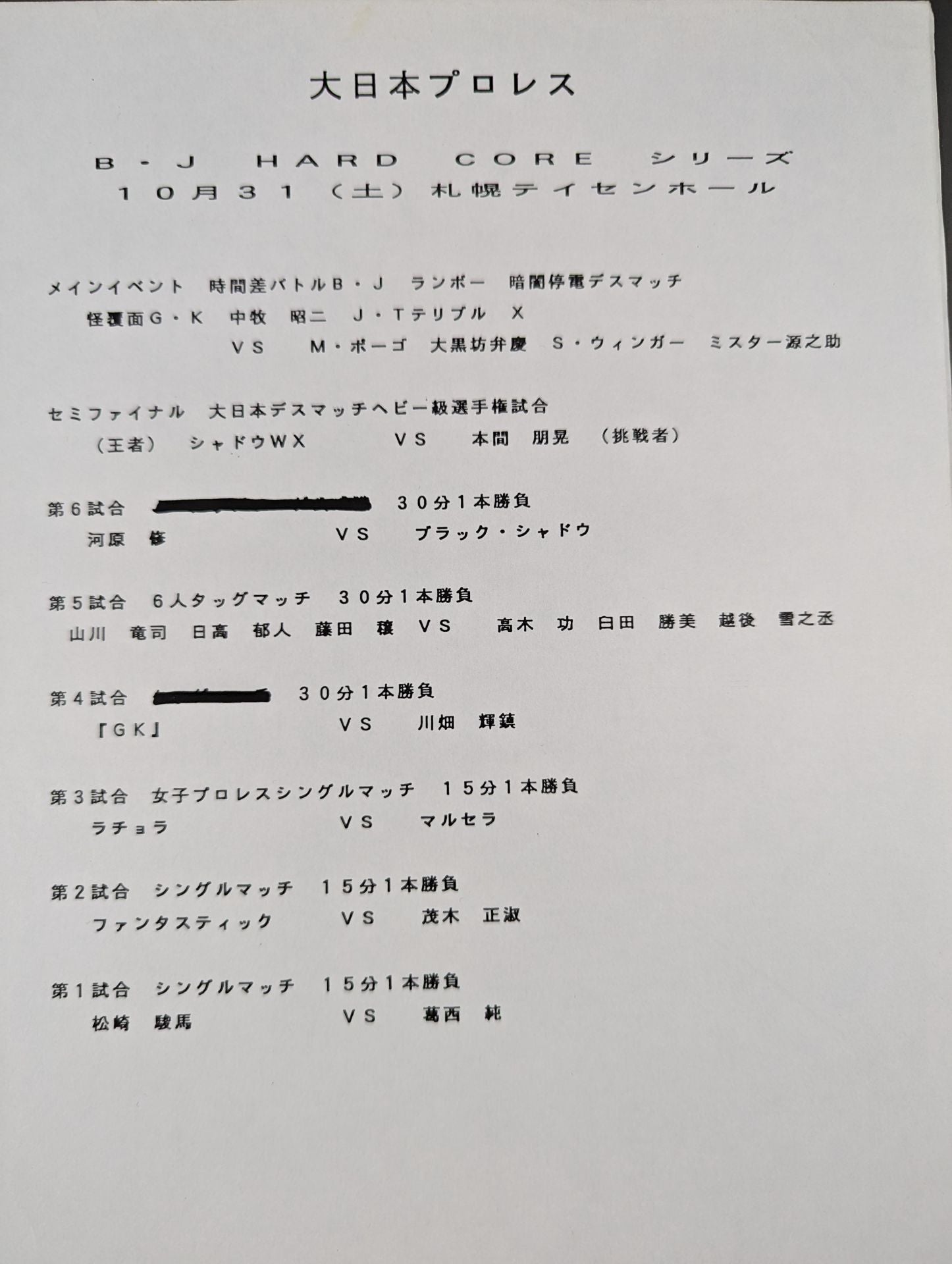 1999 Venue: Sapporo Teissen Hall / List of the matches on the separate sheet: [Darkness Blackout Deathmatch] Phantom Masked G.K. & Shoji Nakamaki & Jason the Terrible & X vs Mr. Pogo & Benkei Daikokubo & S. Winger & Mr. Gennosuke B / J HARD CORE Series