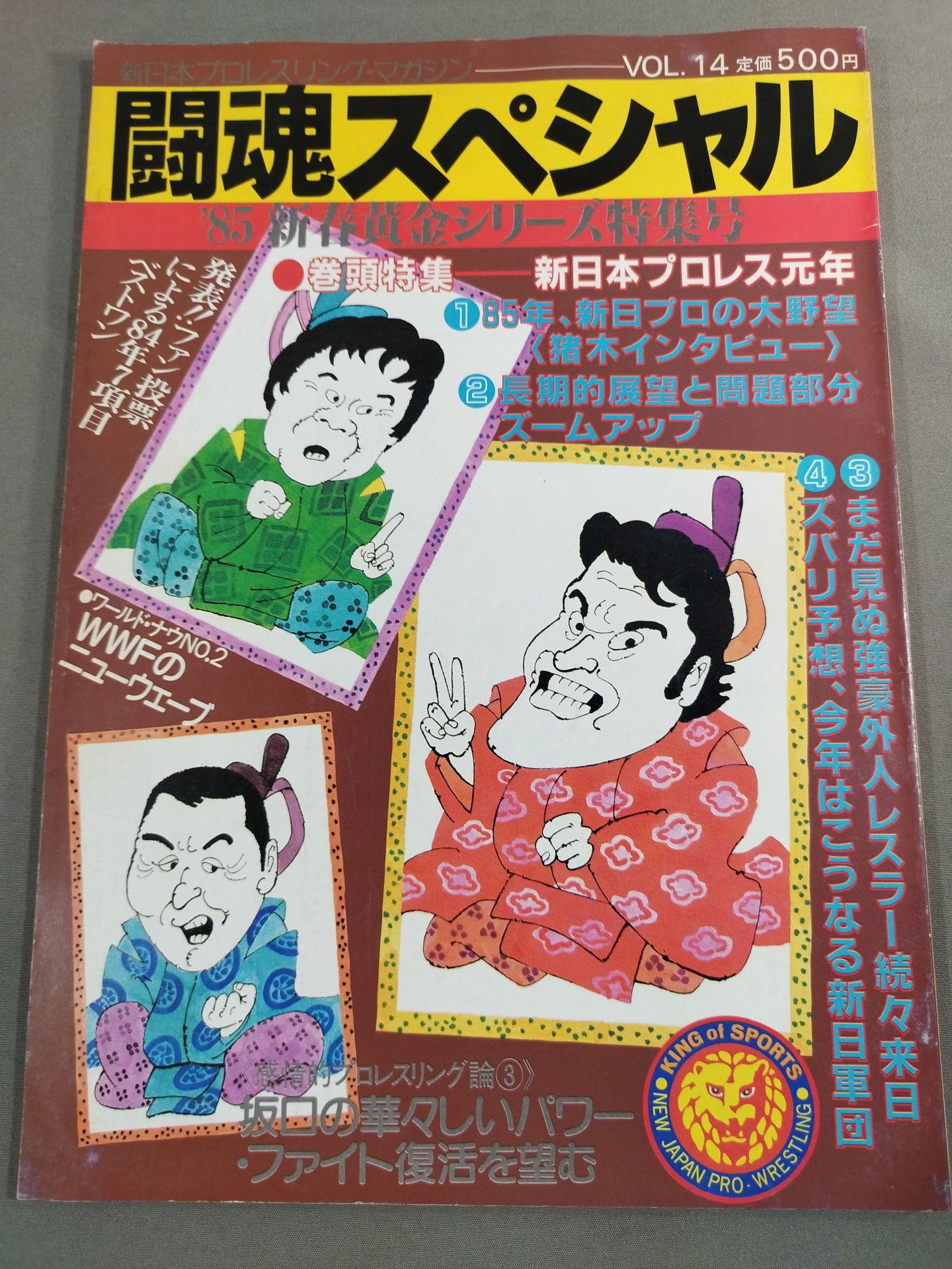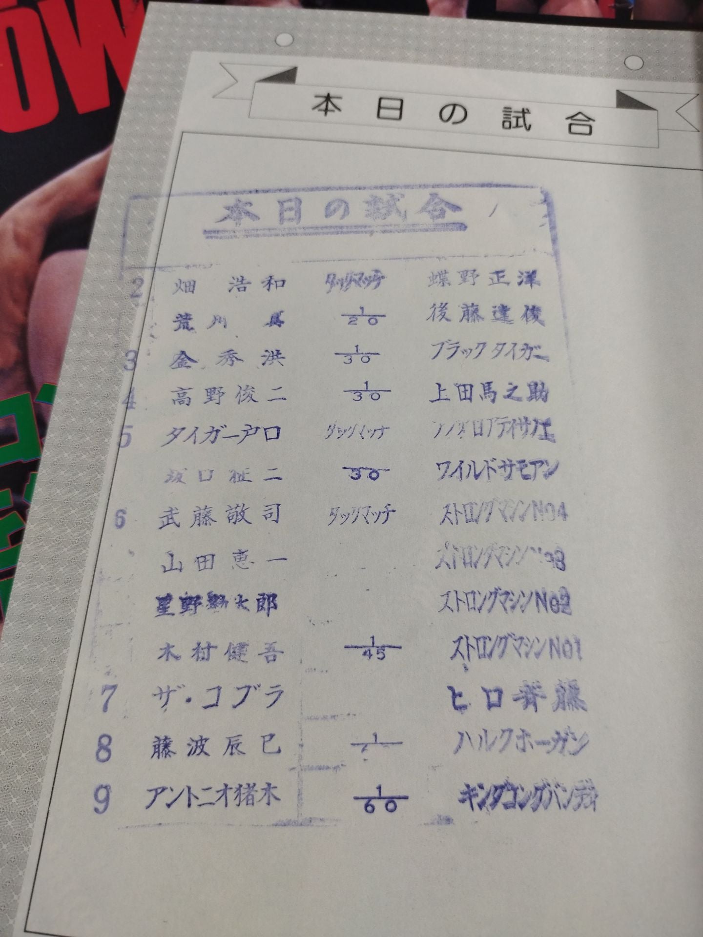 1985 Venue: Osaka Prefectural Gymnasium / stamped with list of matches : [$15,000 body slam match rematch] AntonioInoki vs King Kong Bundy *Special rule that the first person to throw the opponent with a body slam wins the prize. / Tatsumi Fujinami vs Hulk Hogan / WWF Junior HeavyweightFighters Rights Match] The Cobra vs Hiro Saito 85 New Year Golden Series