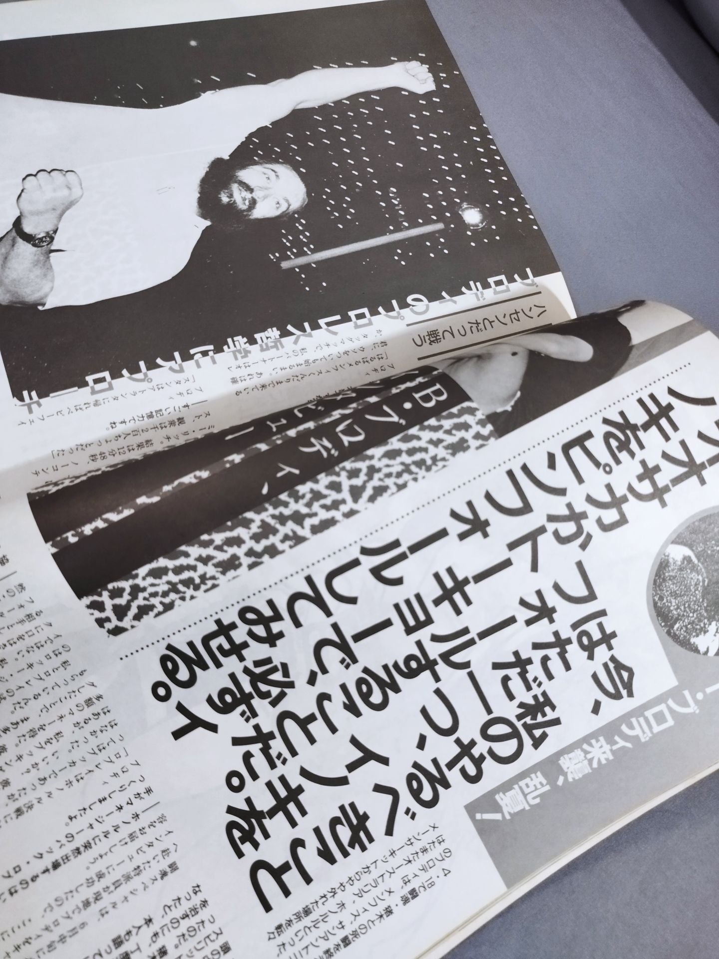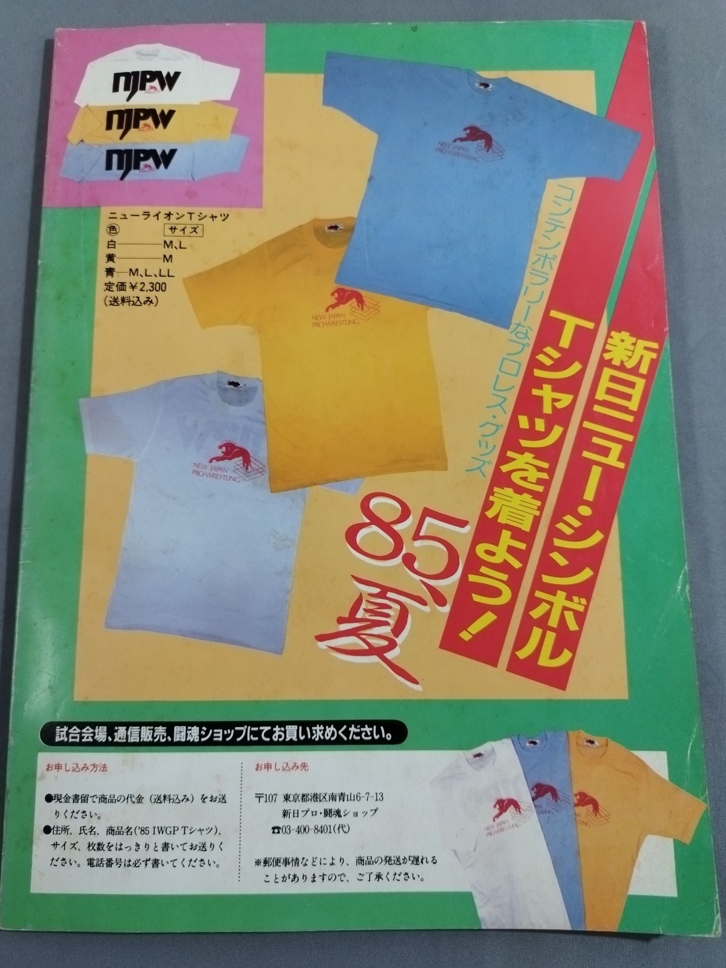 1985 Venue: Ryogoku (final round) / stamped with list of matches : AntonioInoki vs Bruiser Brody / Tatsumi Fujinami vsJimmy Snuka / [NWA Certified World Junior Heavyweight & WWF Certified Junior Heavy Double Fighters Rights Match] The Cobra vs Blank (Don Arakawa) Burning Spirit in Summer 85