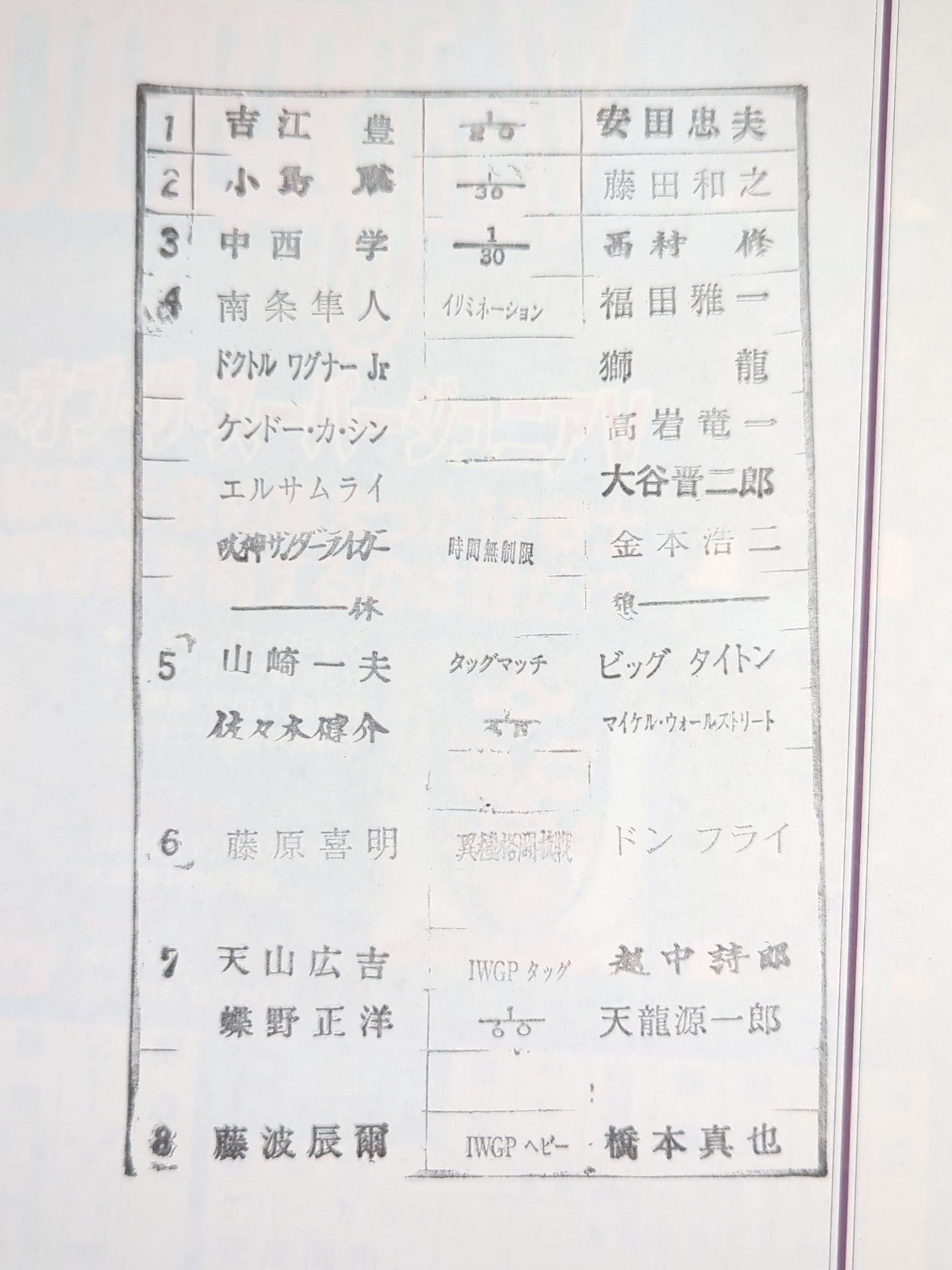 1998 Venue: Japan Budokan (Final Match) / Stamped with List of Matches : IWGP HeavyweightFighters rights match] Tatsumi Fujinami vsShinya Hashimoto / [IWGP Tag Team Title Match] Masahiro Chono & Hiroyoshi Tenzan vs Tenryu Genichiro & Shiro Koshinaka / [Different Martial Arts Battle] Yoshiaki Fujiwara vs Don Frye Best of the Super Junior V. / Super Talented Declaration VII.