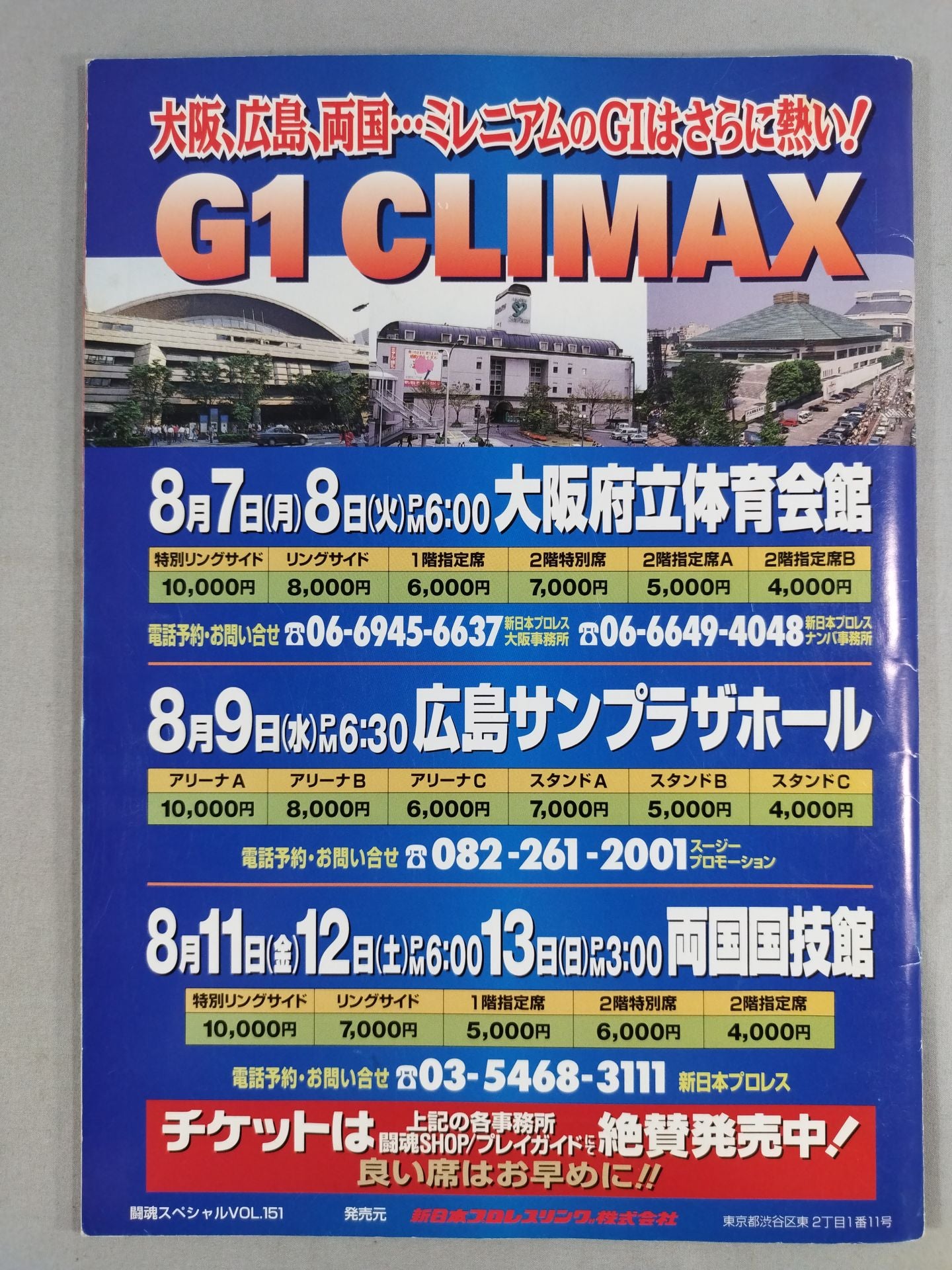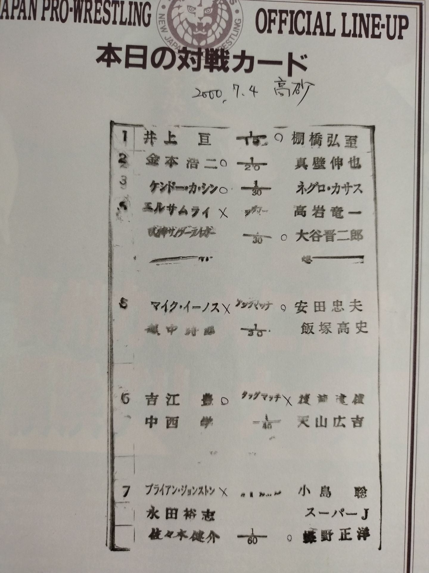 2000 Venue: Takasago City General Gymnasium, Hyogo / stamped with list of matches : Kensuke Sasaki & Yuji Nagata vs Brian Johnston vsMasahiro Chono & Satoshi Kojima & Super J Summer Slaguru 2000