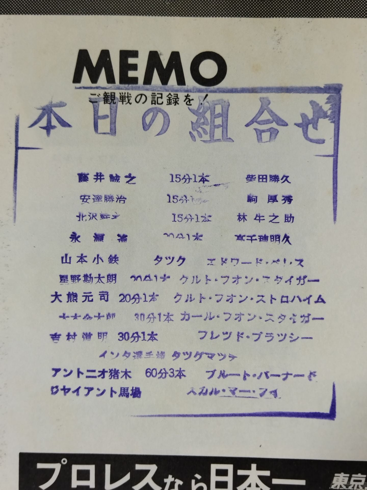 1969 Venue: Osaka Prefectural Gymnasium / Stamped with list of matches : 【International Tag Team】 Fighters rights match] Giant Baba & AntonioInoki vs Skull Murphy & Brute Bernard / Michiaki Yoshimura vs Fred Blassie