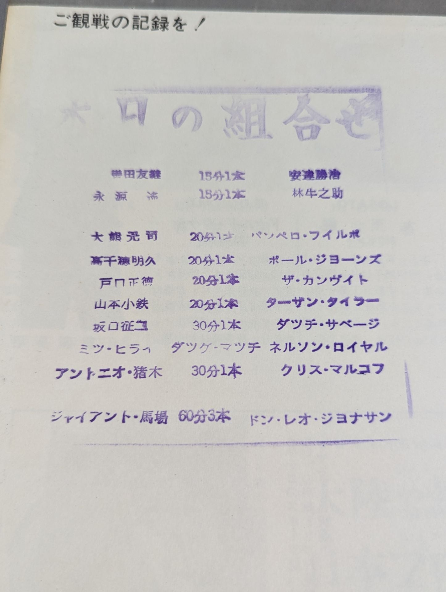 1970 Venue: Nichidai Auditorium (Final Match) / Stamped with List of Matches : [Championship Match] Giant Baba vs Don Leo Jonathan / Antonio Inoki & Mitsu Hirai vs Chris Markoff & Nelson Royal