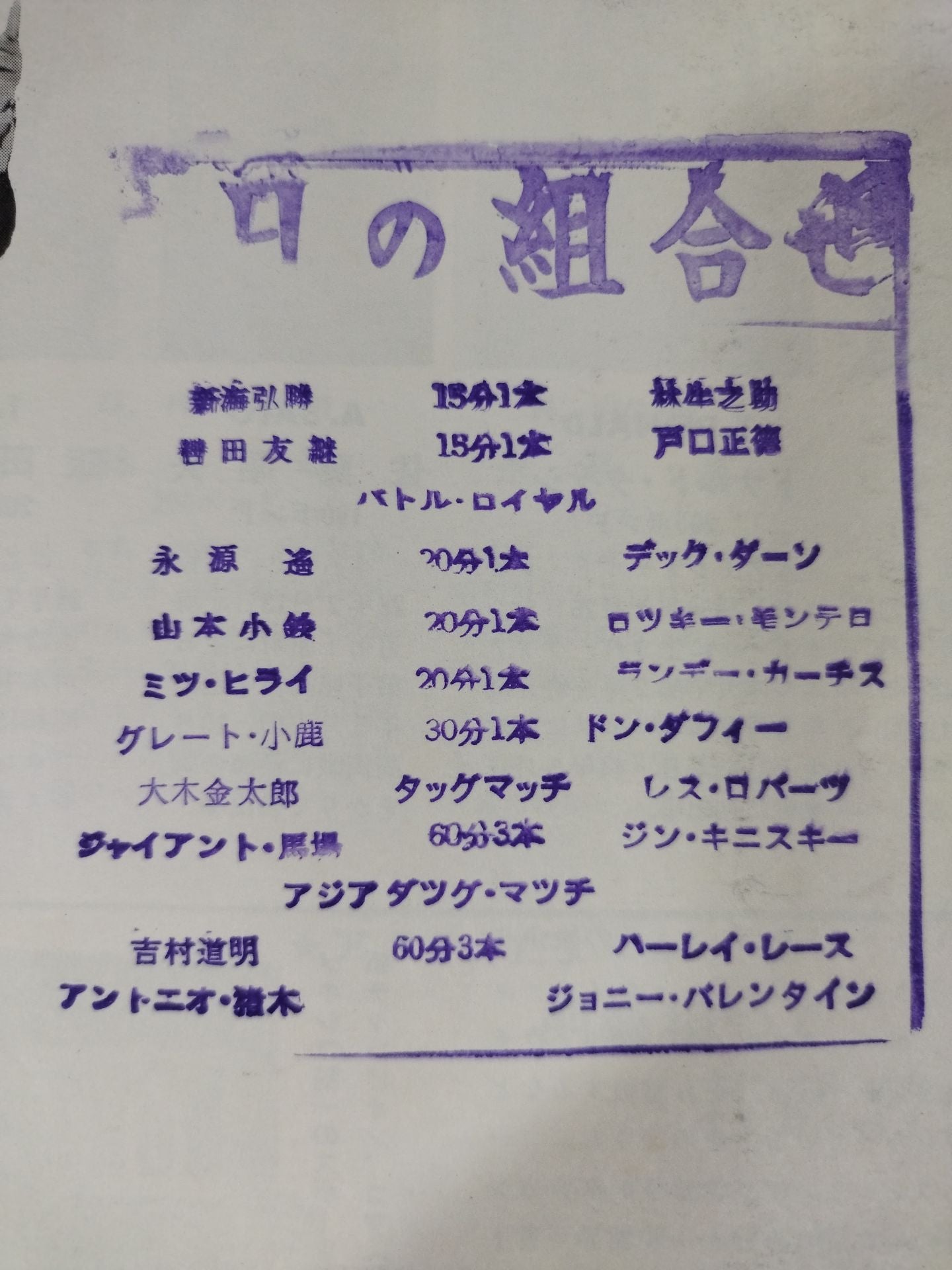 1970 Venue: Sapporo Nakajima Sports Center, Hokkaido / stamped with list of matches : [Asia Tag Team] fighters Rights] Antonio Inoki & Michiaki Yoshimura vs Johnny Valentine &Harley Race (Written as Harley Reis)