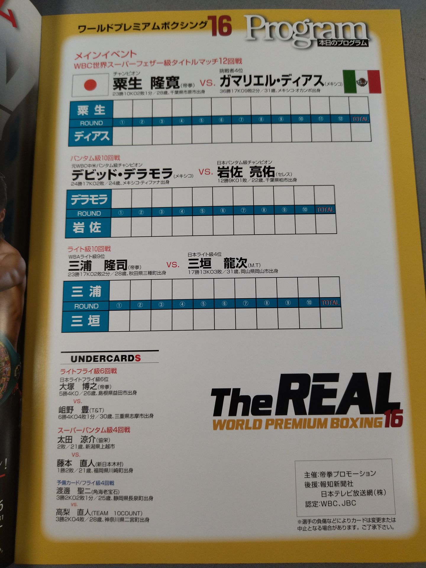 2012 List of the matches is printed : [WBC World Featherweight Title Match] Takahiro Awau vs Gamaliel Diaz / World Premium Boxing 16 / A4 Size