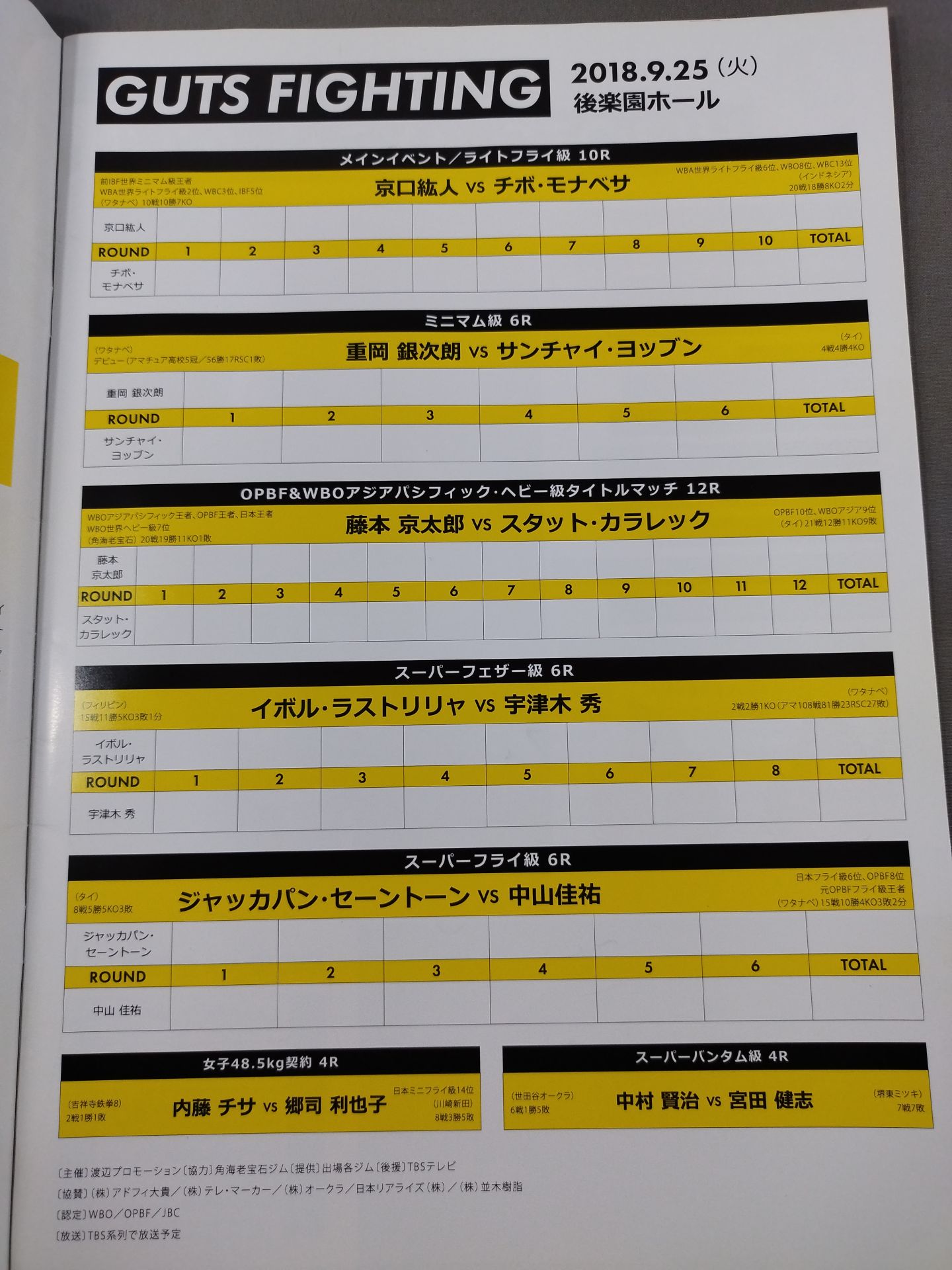 2018 List of the matches is printed: Hiroto Kyoguchi vs Cibo Monaveza / Ginjiro Shigeoka vs Sanchai Yeopun / [OPBF & WBO Asia Pacific Heavyweight Title Match] Kyotaro Fujimoto vs Stade Karalek / Guts Fighting / A4 size