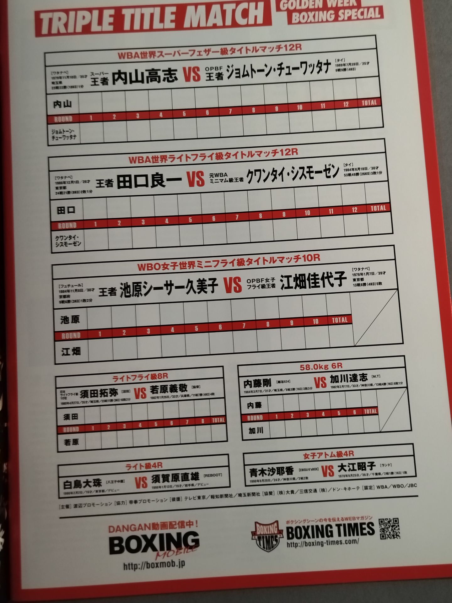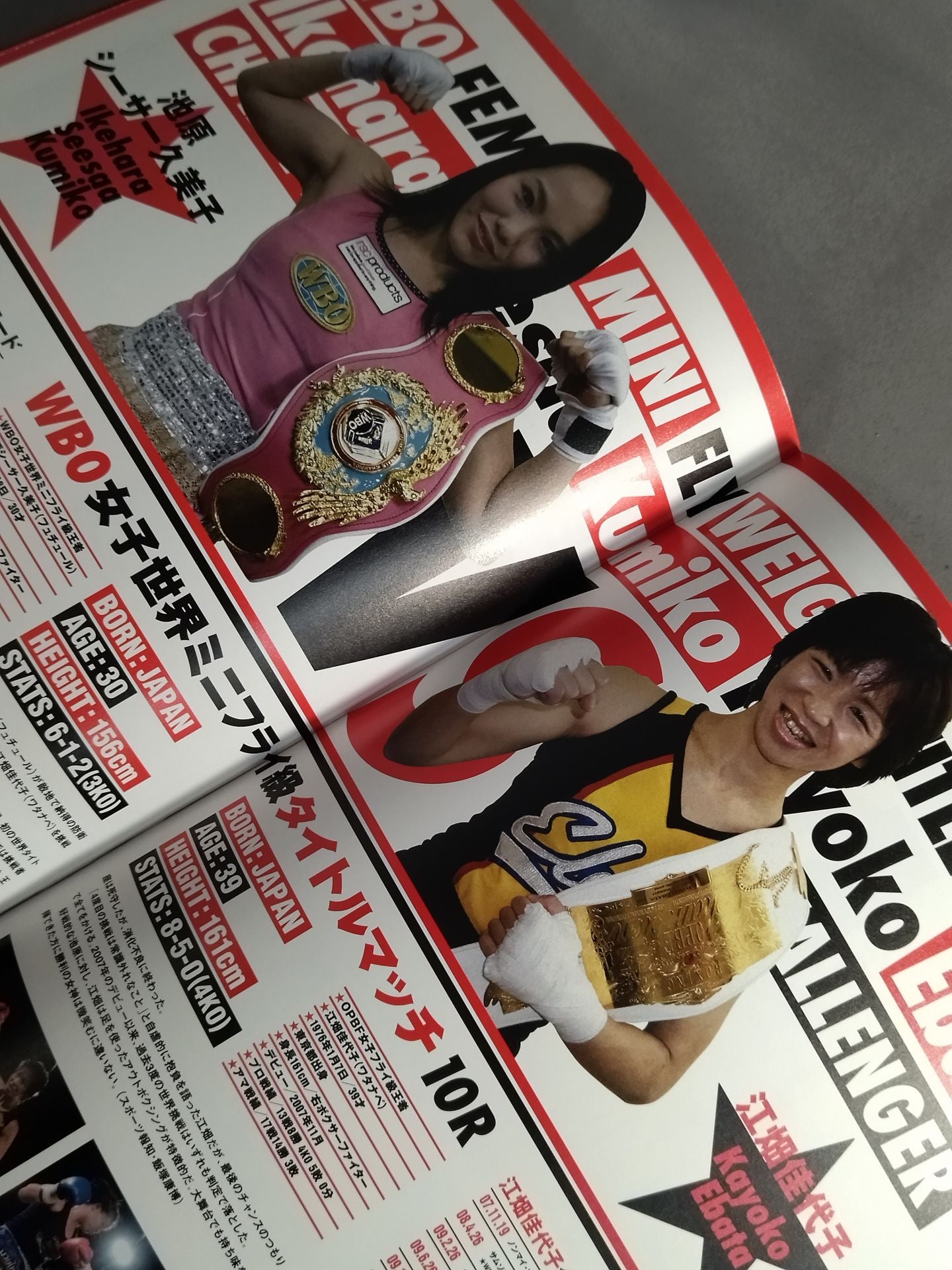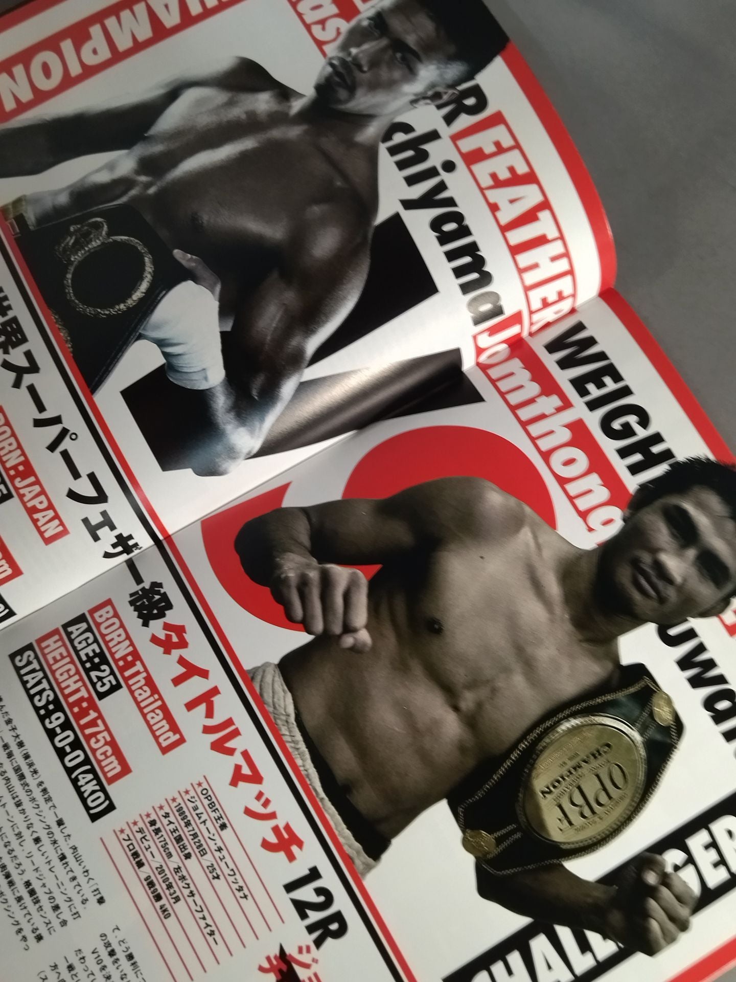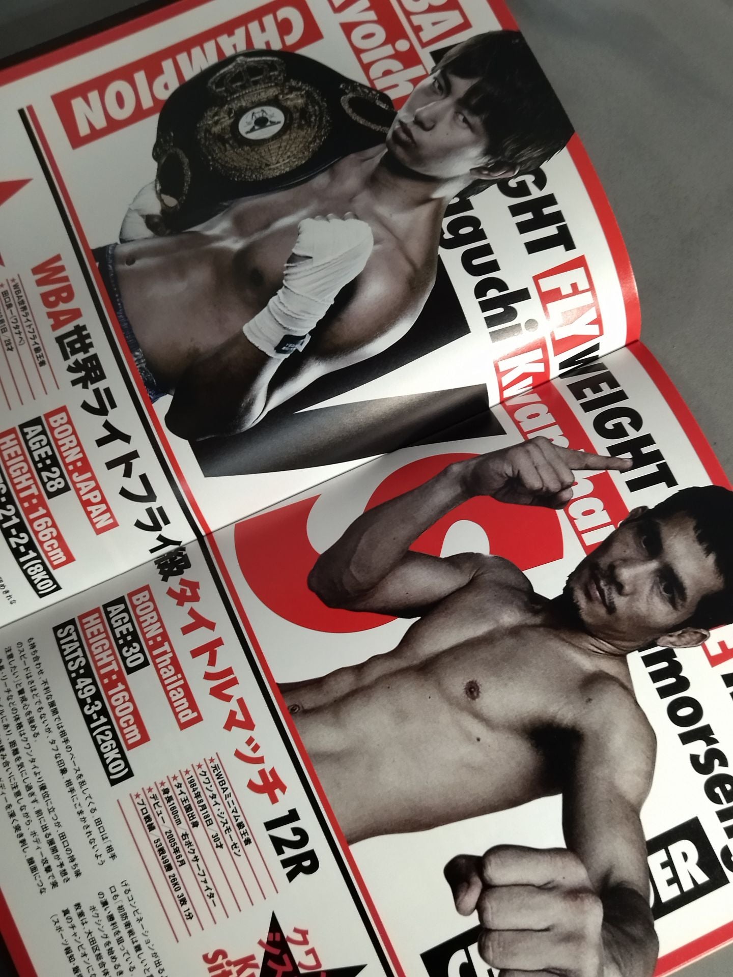 2015 List of the matches is printed: [WBA World Super Featherweight Title Match] Takashi Uchiyama vs Jomthong Chuwattana / [WBA World Light Flyweight Title Match] Ryoichi Taguchi vs Kuantai Sismosen / [WBO Women's World Mini Flyweight Title Match] Kumiko Ikehara vs Kayoko Ebata / A4 size