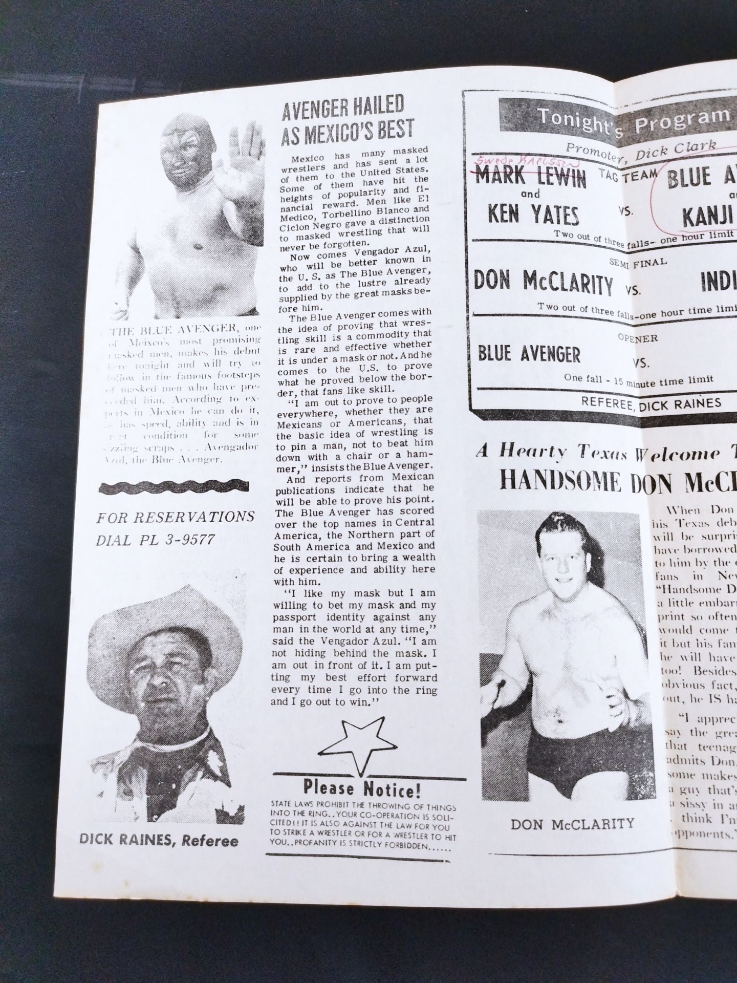 A pamphlet from the time when Inoki , who is in his fifth year of debut, was training as a warrior in Texas, USA. The entire text is written in English. The list of the matches is printed: Mark Ruin & Ken Yatis vs Blue Avenger & Kanji Inoki (Antonio ) Inoki )