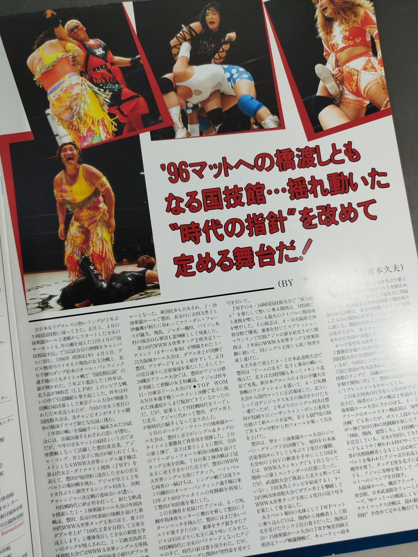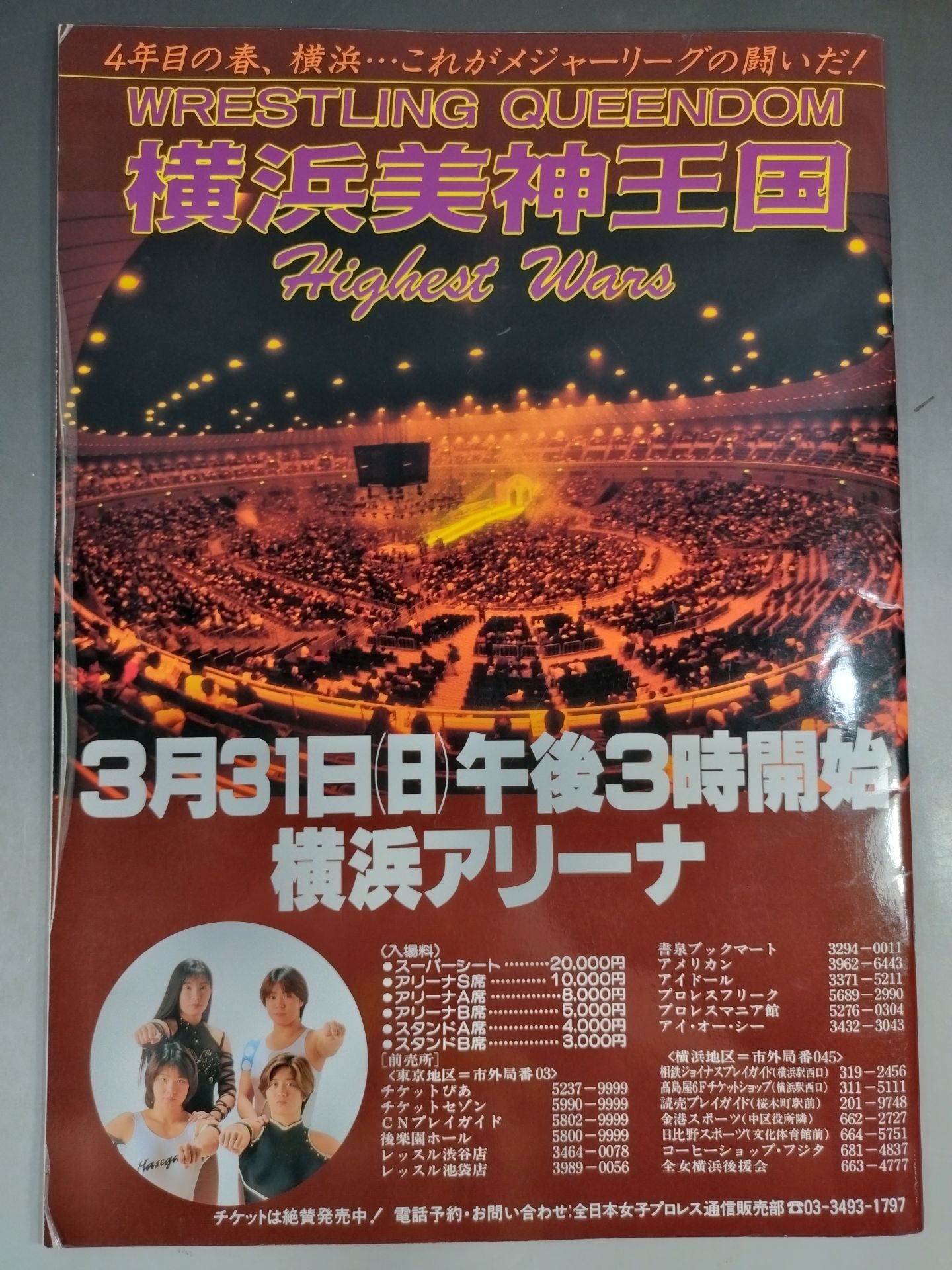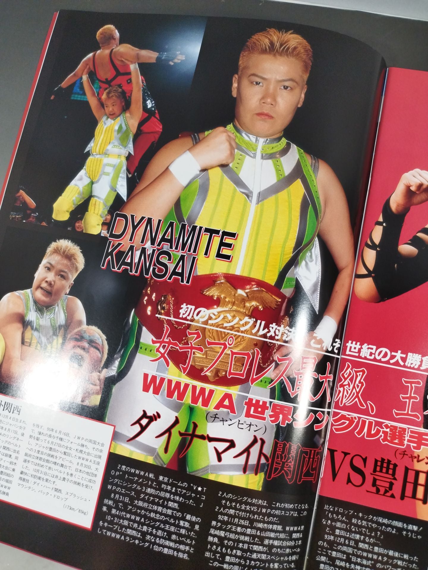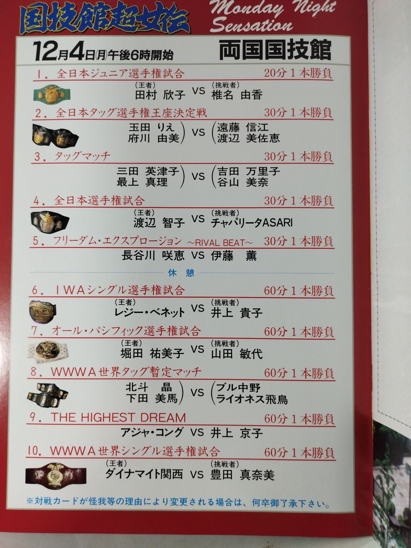 Venue: Ryogoku / list of the matches is printed: 【WWWA World Single Fighters rights] Dynamite Kansai vs Manami Toyota / Aja Kong vs Kyoko Inoue / 【 WWWA World Tag Team Interim Match] Akira Hokuto & Mima Shimoda vs Lioness Asuka & Bull Nakano / [All Pacific Fighters ] Gon] Yumiko Hotta vs Toshiyo Yamada / [IWA Single Fighters ] Reggie Bennett vs Takako Inoue