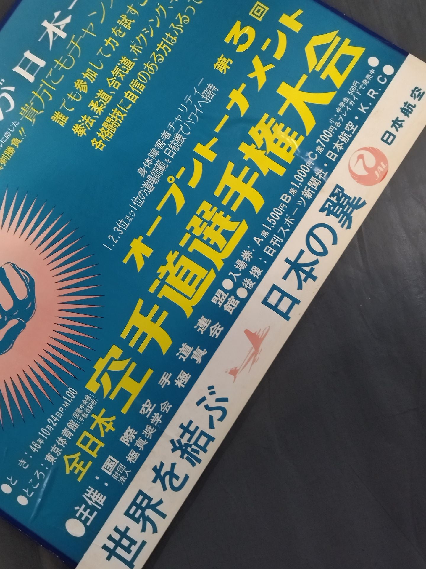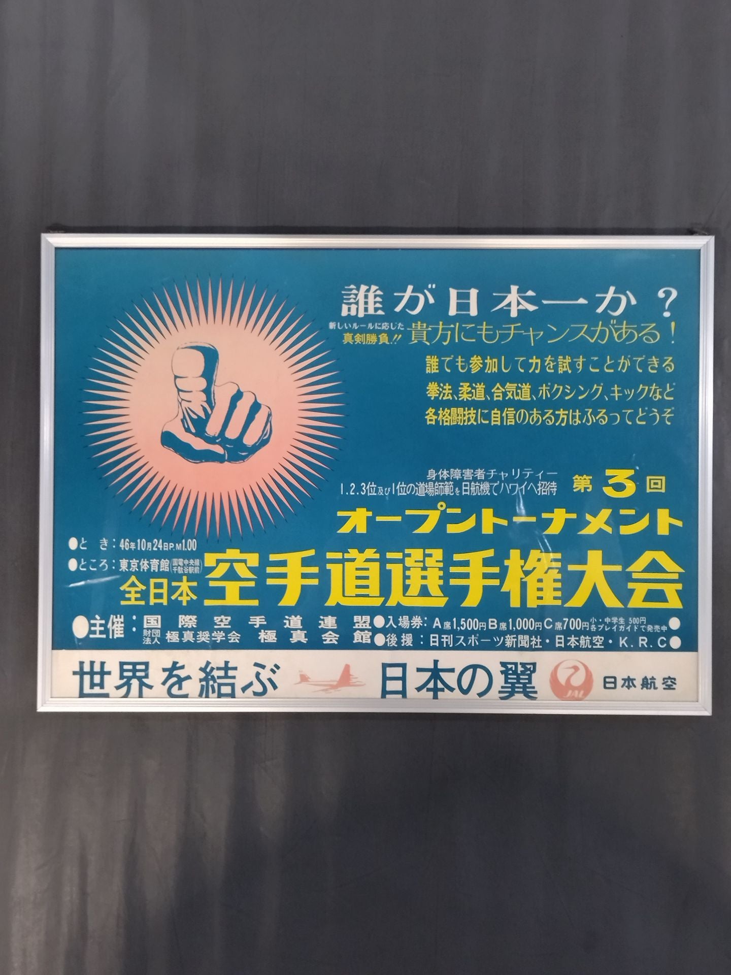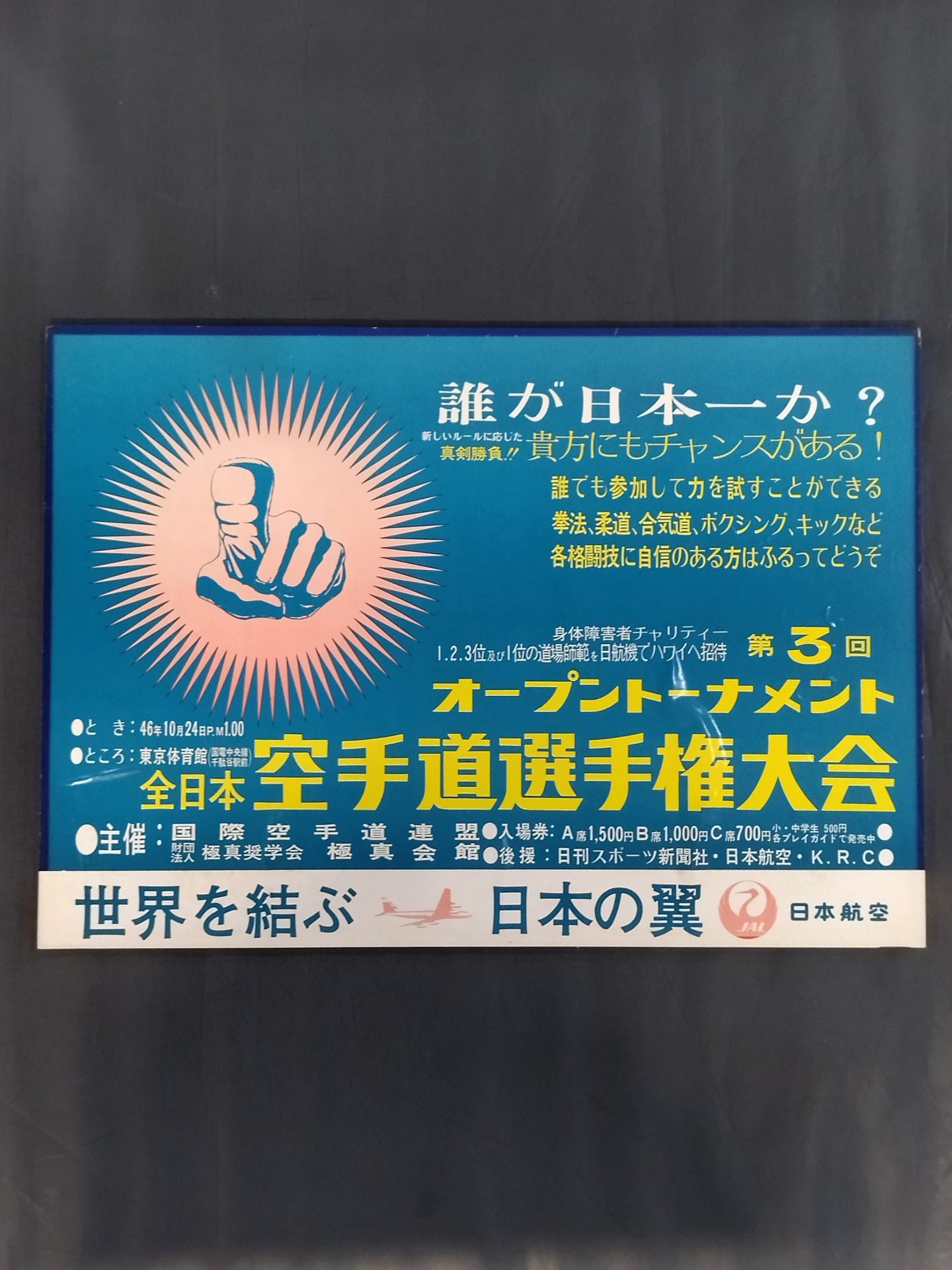 1971 Winner: Katsuaki Sato Runner-up: Yasuhiko Oyama 3rd place: Satoru Oishi / Who is the best in Japan? Serious competition according to the new rules! You've got a chance! Anyone can participate and test their strength Kempo, Judo, Aikido, Boxing, Kicking, etc. If you have your own martial arts, please swing 1.2.3rd and 1st place dojo masters are invited to Hawaii on a JAL aircraft Size: 52 cm × 36 cm × 1 cm (thickness) Poster panel * The poster is attached to a Styrofoam panel. kyokushin karate poster Oyama Kyokushin KARATE Mas Oyama (Masutatsu Oyama)