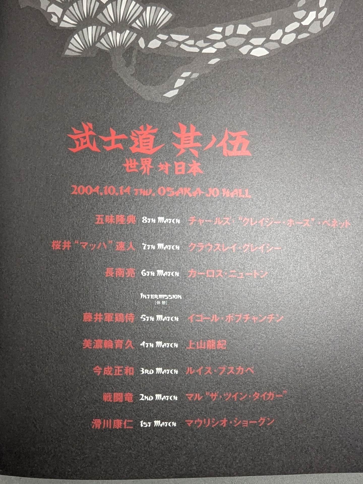 Venue: Osaka Castle Hall / list of the matches is printed : Takanori Gomi vs. Charles "Crazy Horse" Bennett / Hayato "Mach" Sakurai vs. Crow rubbing Lee Gracie Part 5