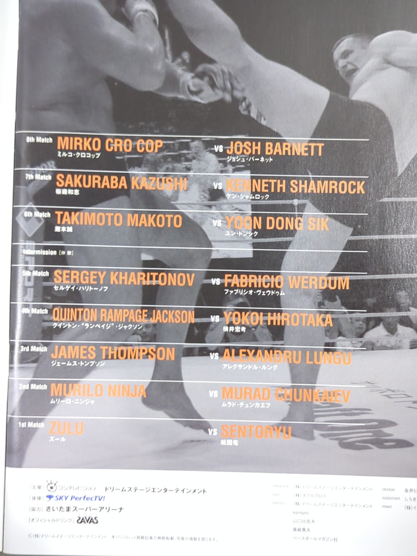 Venue: Saitama Super Arena / list of the matches is printed :Mirko Cro Cop vs Josh Burnett / Kazushi Sakuraba vs Ken Shamrock