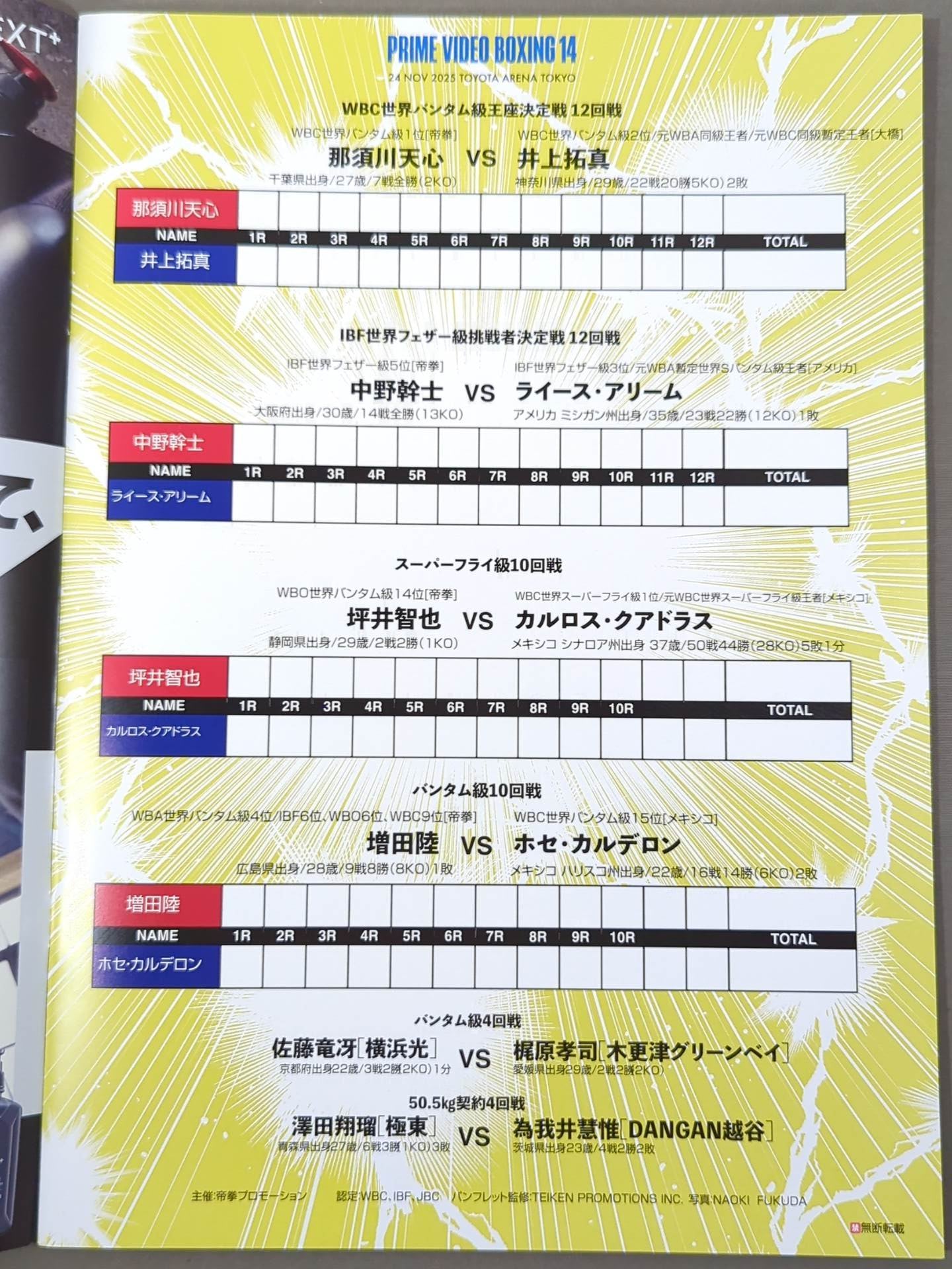 Venue: Toyota Arena Tokyo / list of the matches is printed : [WBC World Bantamweight Championship] Tenshin Nasukawa vs Takuma Inoue / [IBF World Featherweight Challenger Match] Mikiji Nakano vs Rice Areem