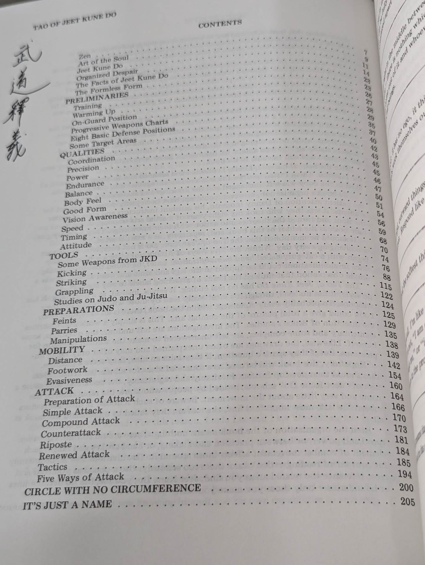 A book that represents Bruce Lee's martial arts philosophy and perspectives. The science and philosophy behind Jeet Kune Do, the combat system that Lee pioneered himself, is explained in detail through his own illustrations. After Lee's death, his widow Linda Lee and martial artist Dan Innosanto edited and published the material. The first edition was published in 1975.