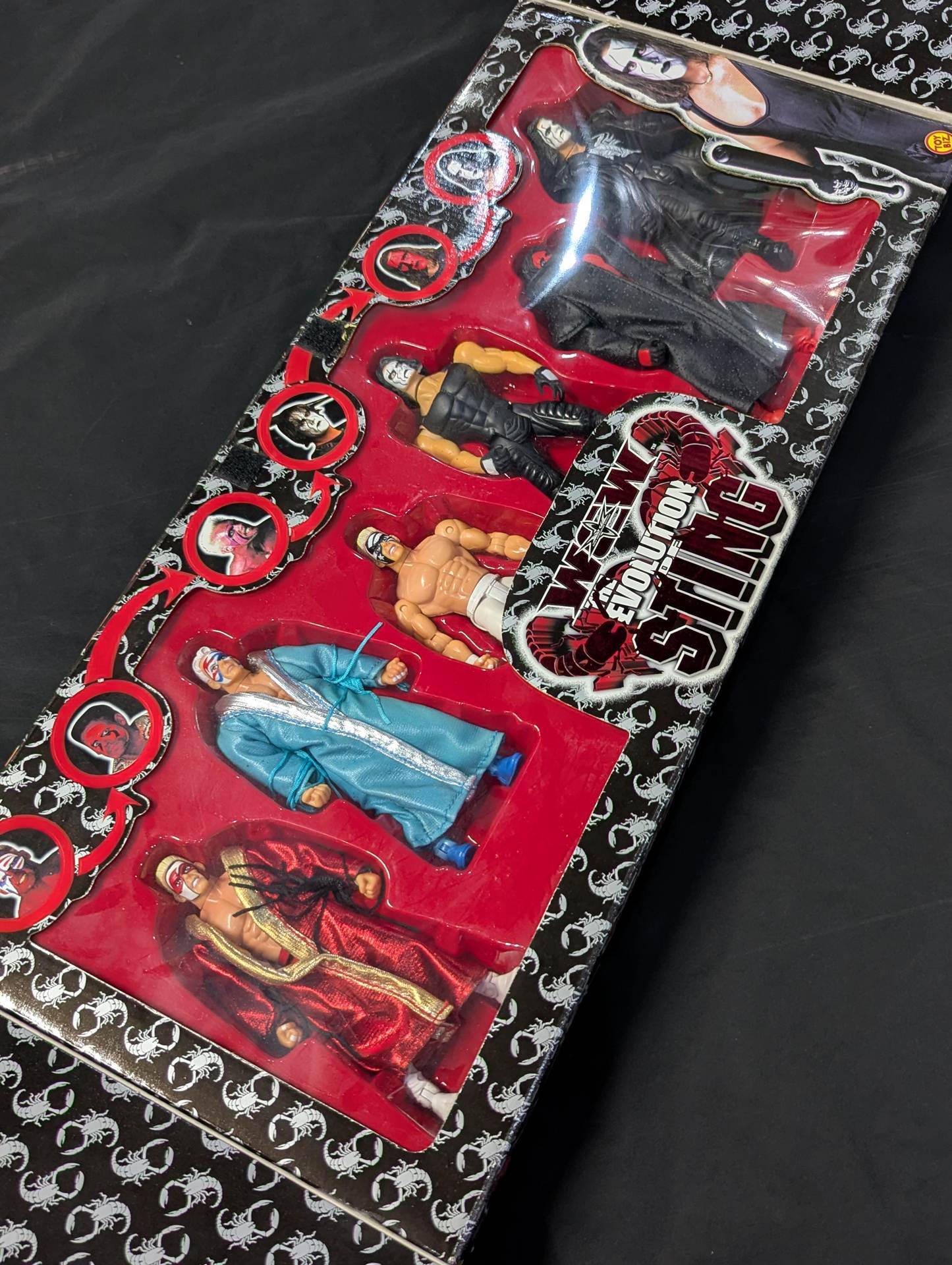 A set of 6 Stings made by TOYBIZ, from the horn-cut Sting to the white paint and black gown Sting.