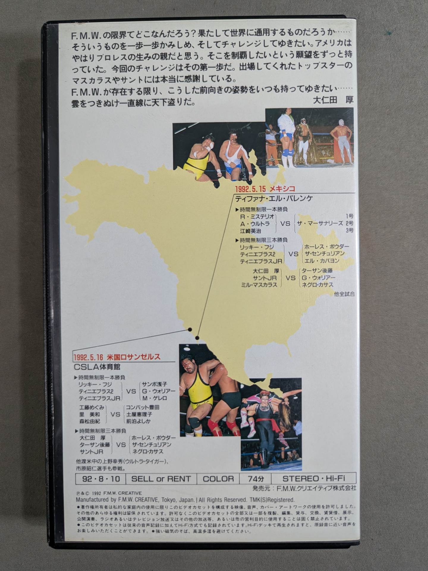 1992.05.15 Mexico Onita, Santo JR, Mil Mascaras vs Tarzan Goto , G. Warrior, Negro Casas, etc. 1992.05.16 Los Angeles Ohnita, Santo JR, Tazan Goto vs. Horace Pouder, The Centurian, Negro Casas, etc. ○ What are the limits of FMW? Is it really world-class? The United States is the creator of Pro Wrestling. I always had the desire to conquer it. As long as FMW exists, I want to always have this positive attitude. It is a steal of the world in a straight line through the clouds...