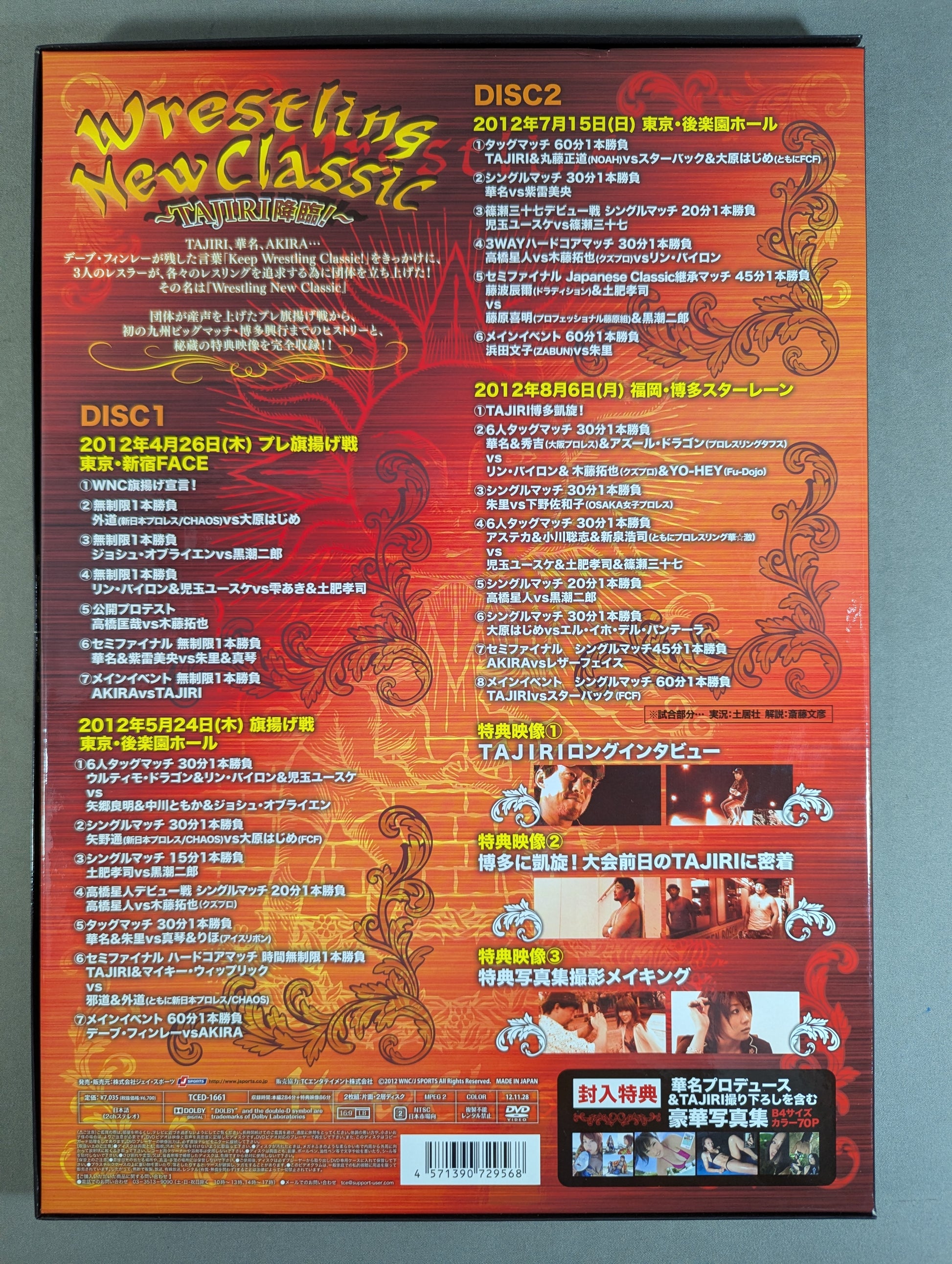 ○DISC1: April 26, 2012 (Thursday) Pre-First Show, Shinjuku FACE 7 matches / May 24, 2012 (Thursday) Korakuen Hall 7 matches ○DISC2 : July 15, 2012 (Sun) Korakuen Hall All 6 matches / August 6, 2012 (Sun) Hakata Starain / Bonus video: TAJIRI long interview & close-up document & bonus photo Collection Shooting Making [Enclosed Bonus] Produced by KANA (Asuka) & TAJIRI Newly Taken Gorgeous Photos (Color 70 pages) Full of troubled pictorial by KANA (Asuka) & Makoto & Nozabichi & Akari!