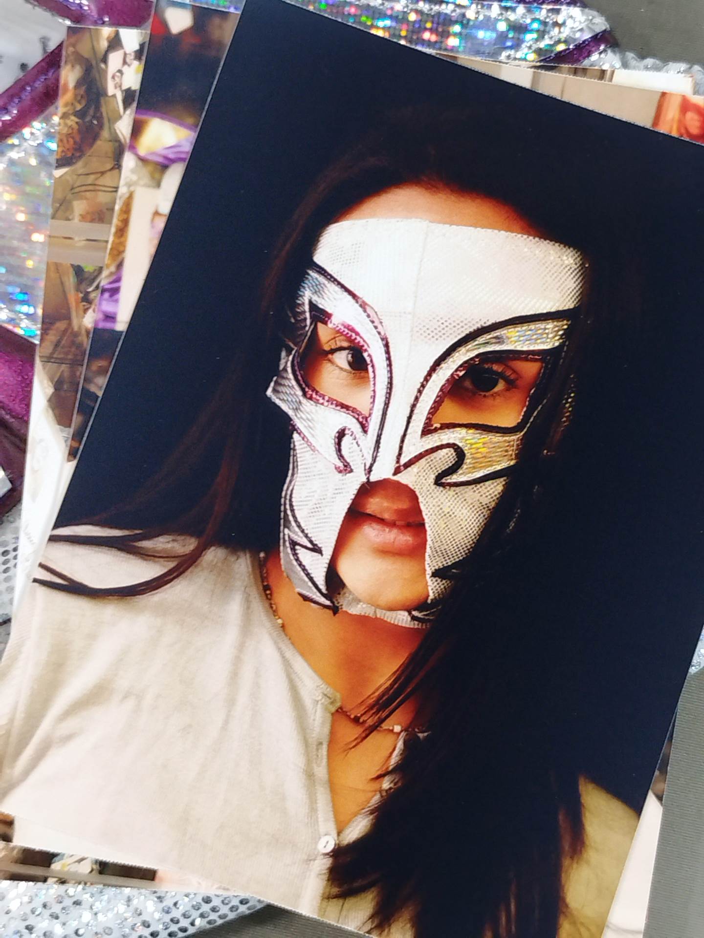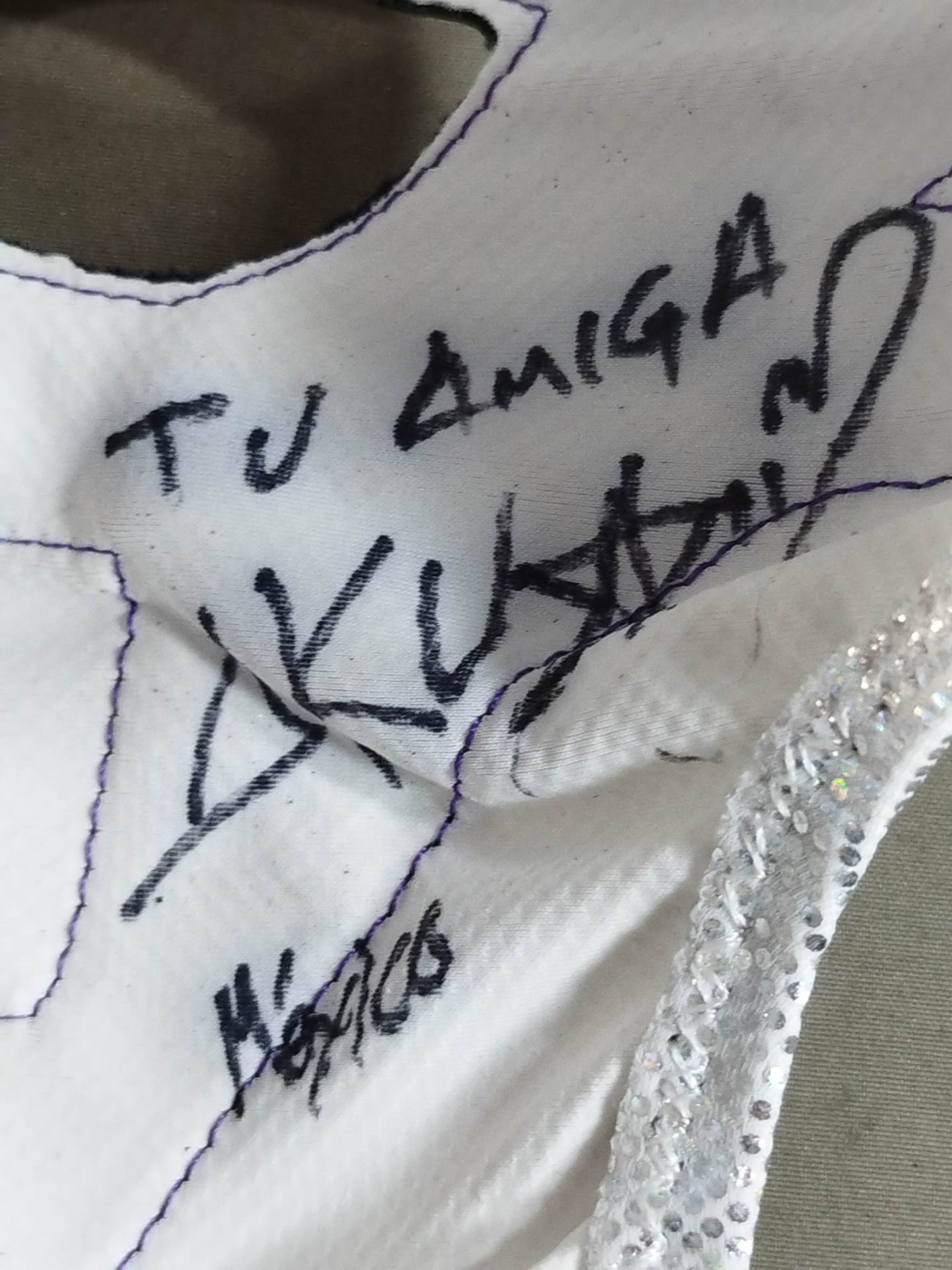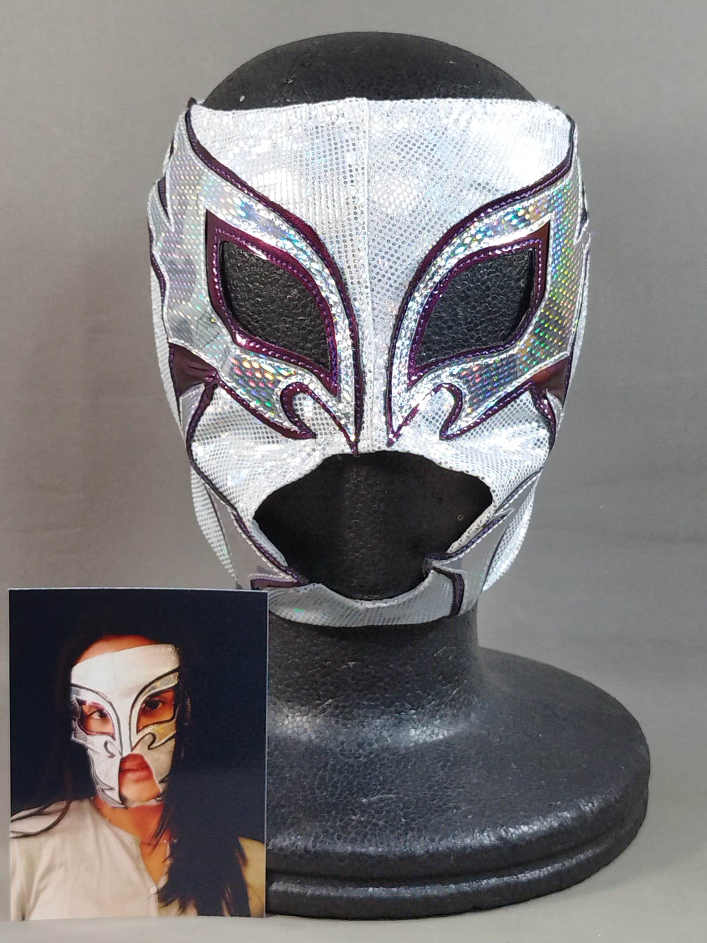 サイン入り 着用写真付 白銀特殊レオタード生地 紫メタリック地銀特殊フチ