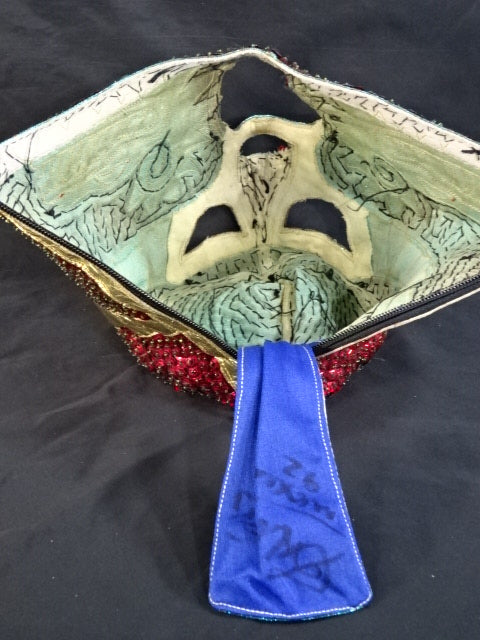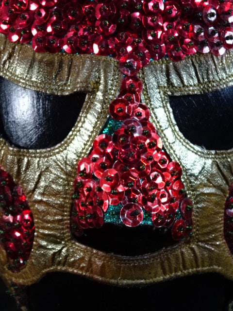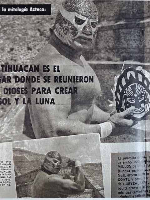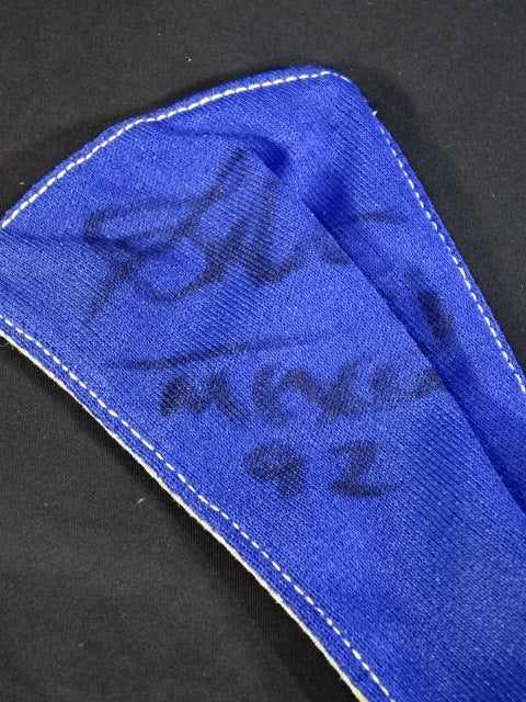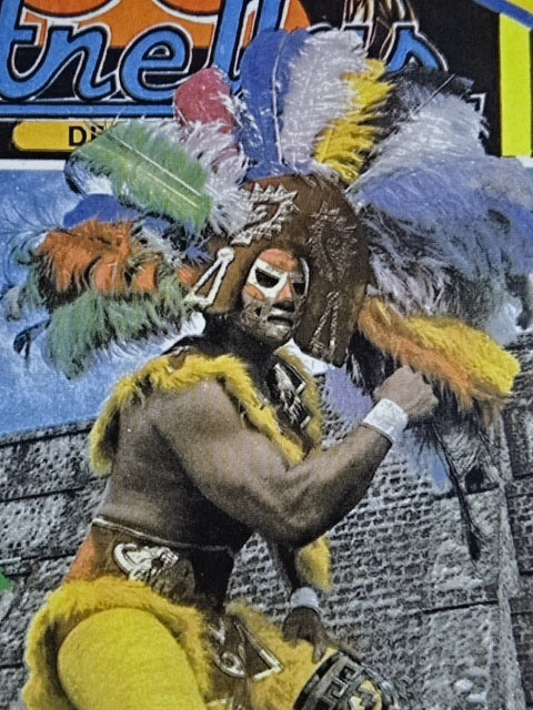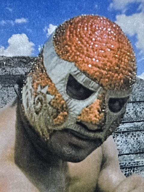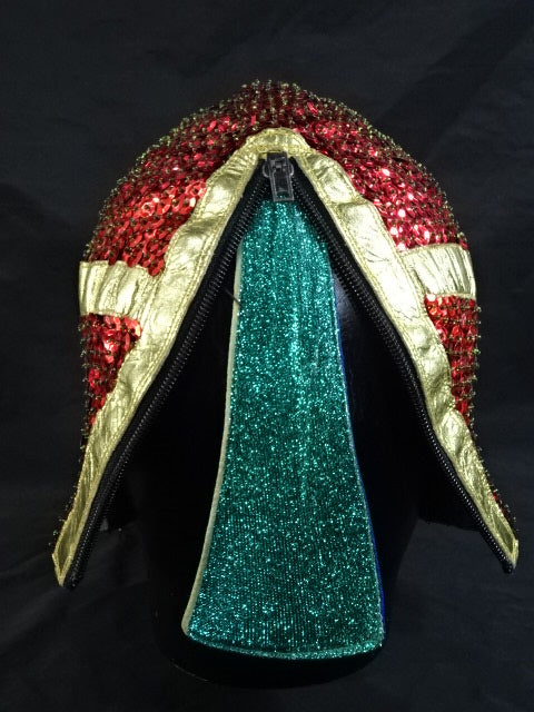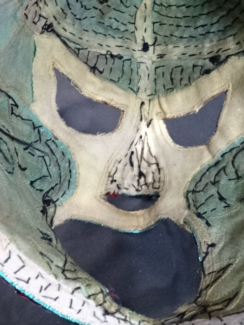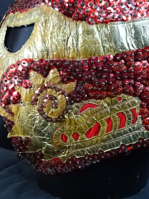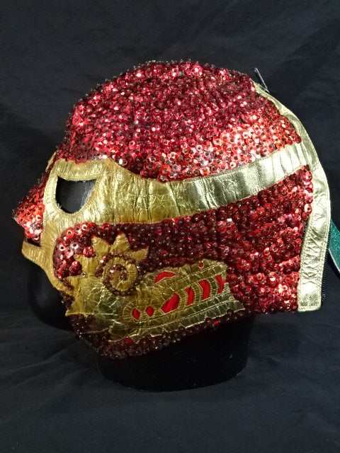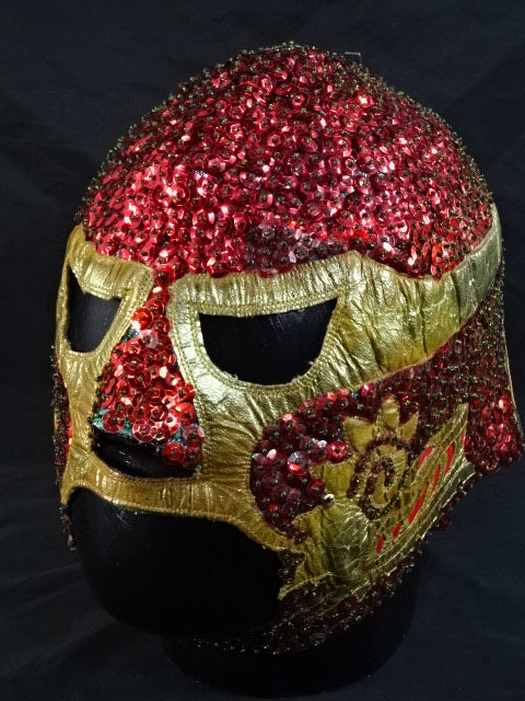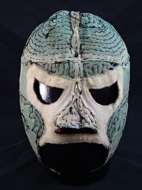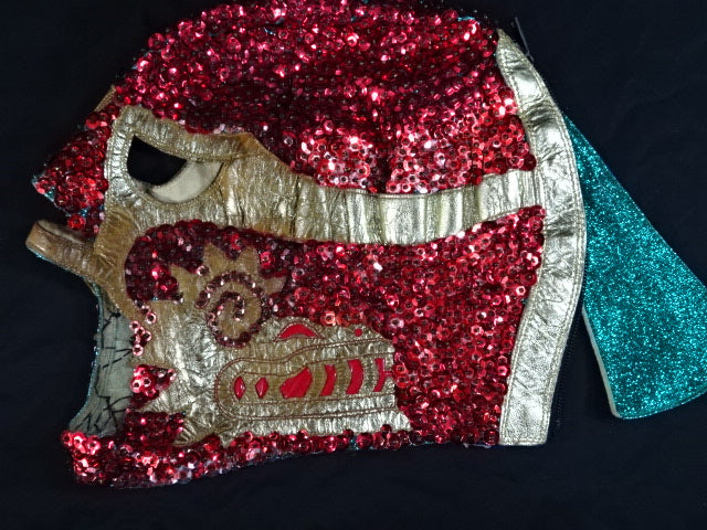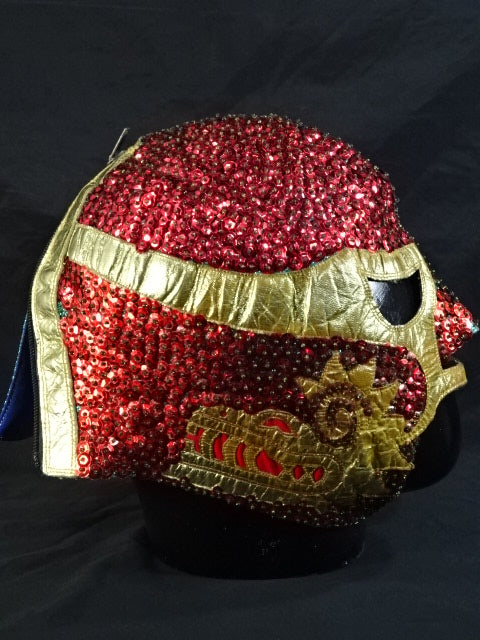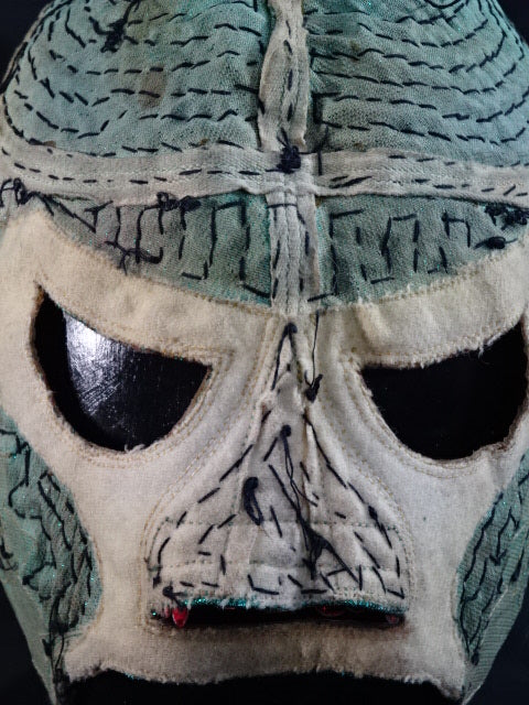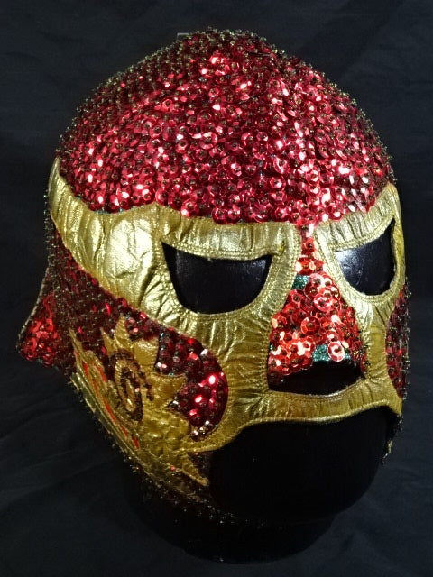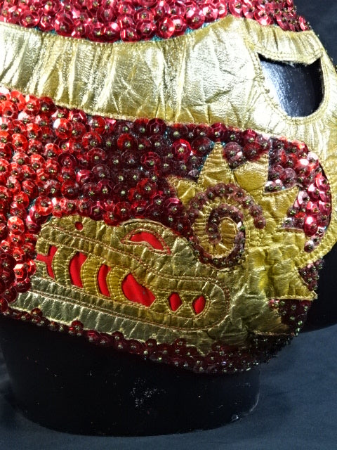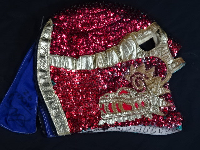 ★本人長期間実使用!! 80年代当時モノ★ ククルカンタイプ サイン入り 赤スパンコール装飾生地(下地は緑ラメ) 金革フチ ベロは緑ラメと濃青ジャージ生地 裏当ては羊毛素材 喉テープは無地 チャック銘柄(IDEAL) 1986年11月にメキシコで発売されたルチャ雑誌「ASES」のグラビアや1987年12月にメキシコシティで行われたBoxy Lucha誌が主催し、各部門の最優選手を決める授賞式「レイナ・デ・ルチャ・リブレ1988」などで使用(カネックは最優秀ルード賞を受賞)、サインの年号が92と書かれていることや、使用感を見れば1992年8月のW☆ING来日時までの6年間使用したと推測できる。 着用写真付 1980年代中期にアレハンドロ・ロドリゲス氏によって製作されたもの ※資料は全て該当誌をカラー印刷した写真です。
