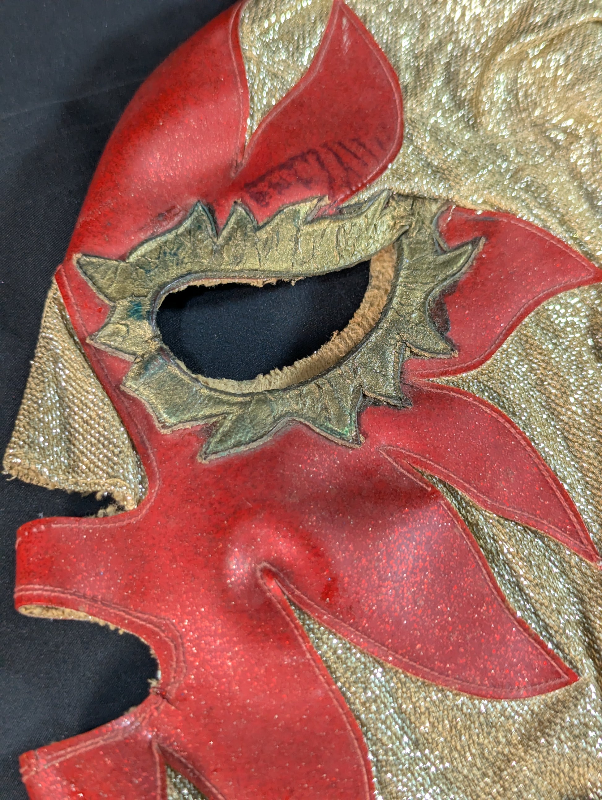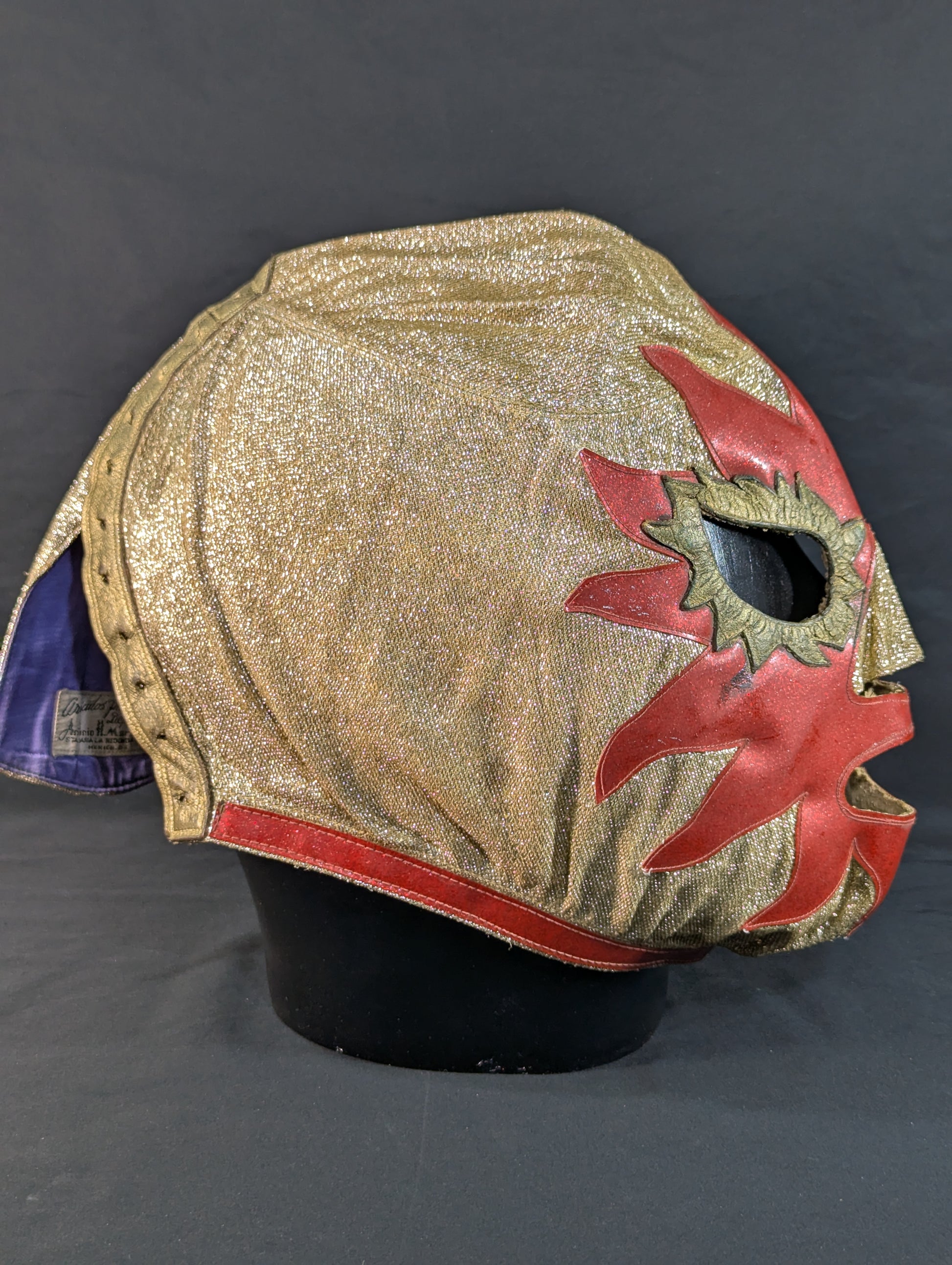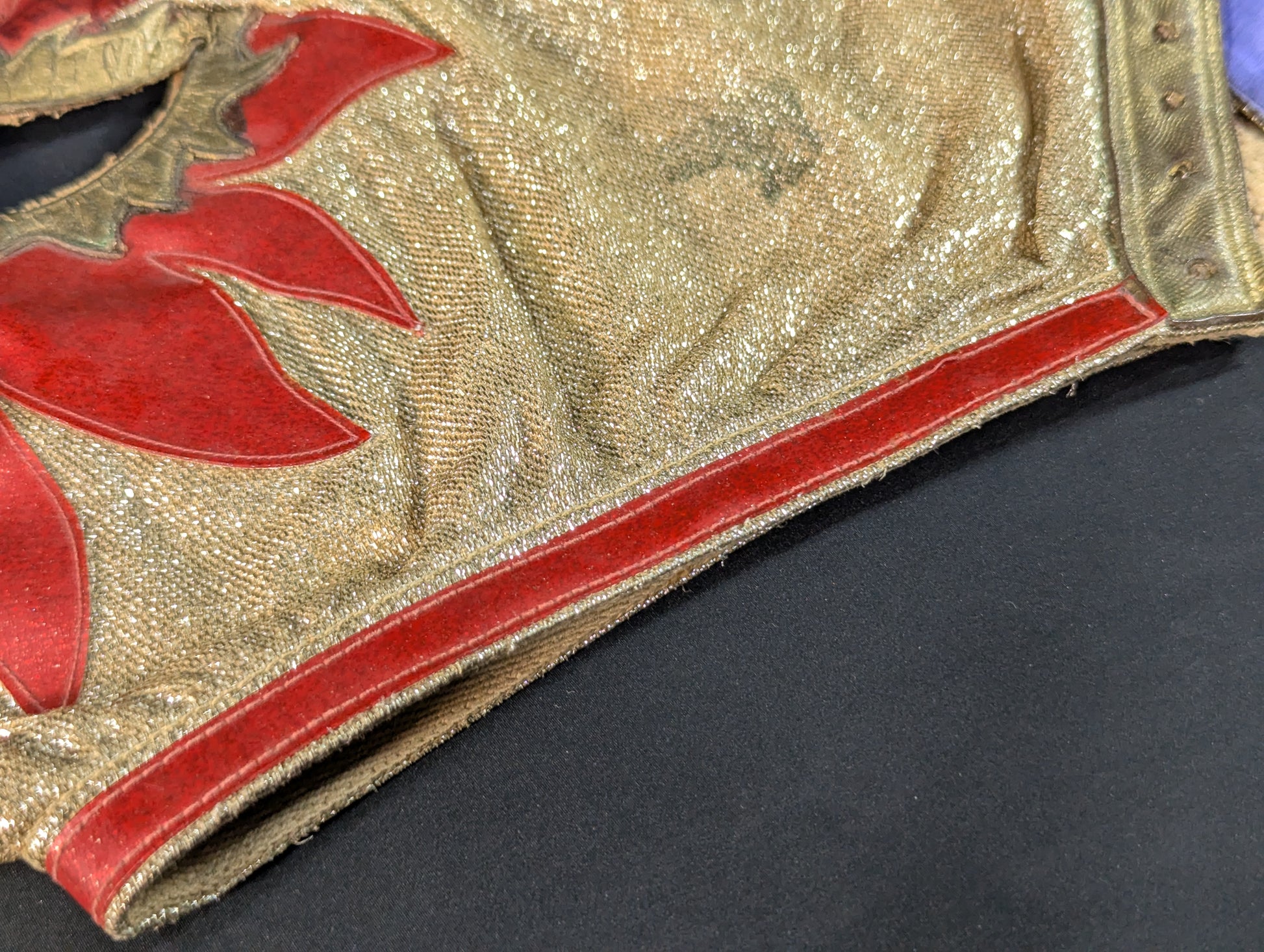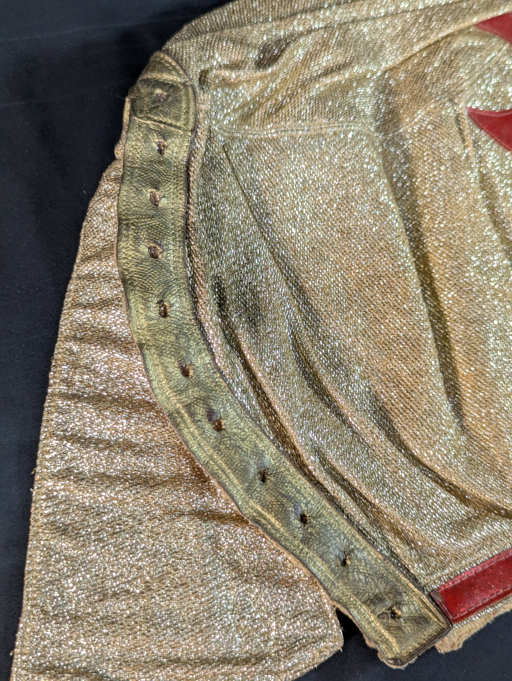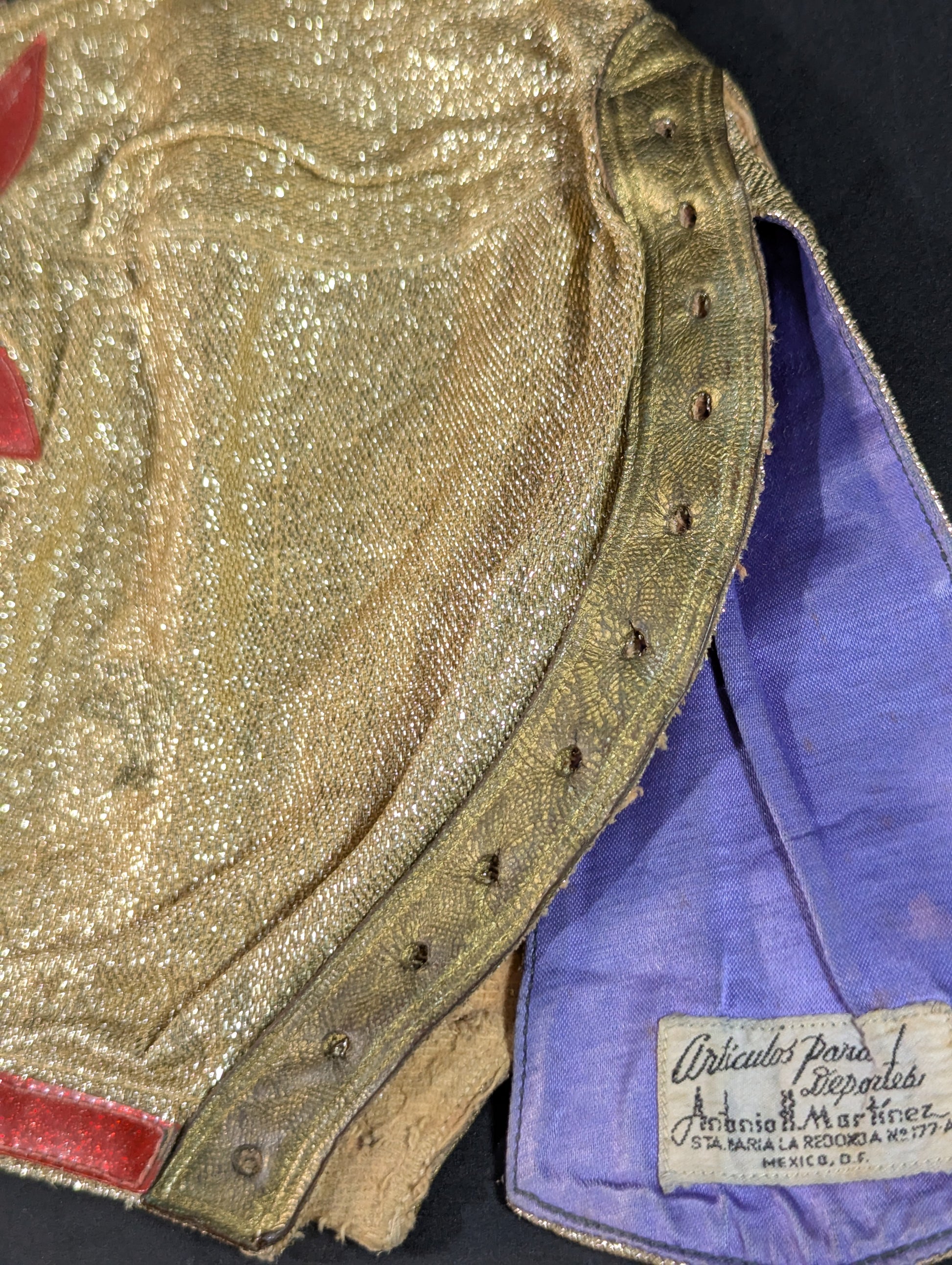 ★本人実使用!! 70年代当時モノ★ 旧金ラメ 赤特殊フチ&金革フチ(紐通し部分も同色本革) ベロは同色の旧ラメと青紫色の旧サテン生地 喉テープは縦幅1.6cmで薄青のセンターステッチ 横タグ ~神秘なるマスク芸術~マルチネス編の30ページに掲載されている現物マスク 1970年代中期にアントニオ・ウンベルト・マルチネス氏により製作されたもの