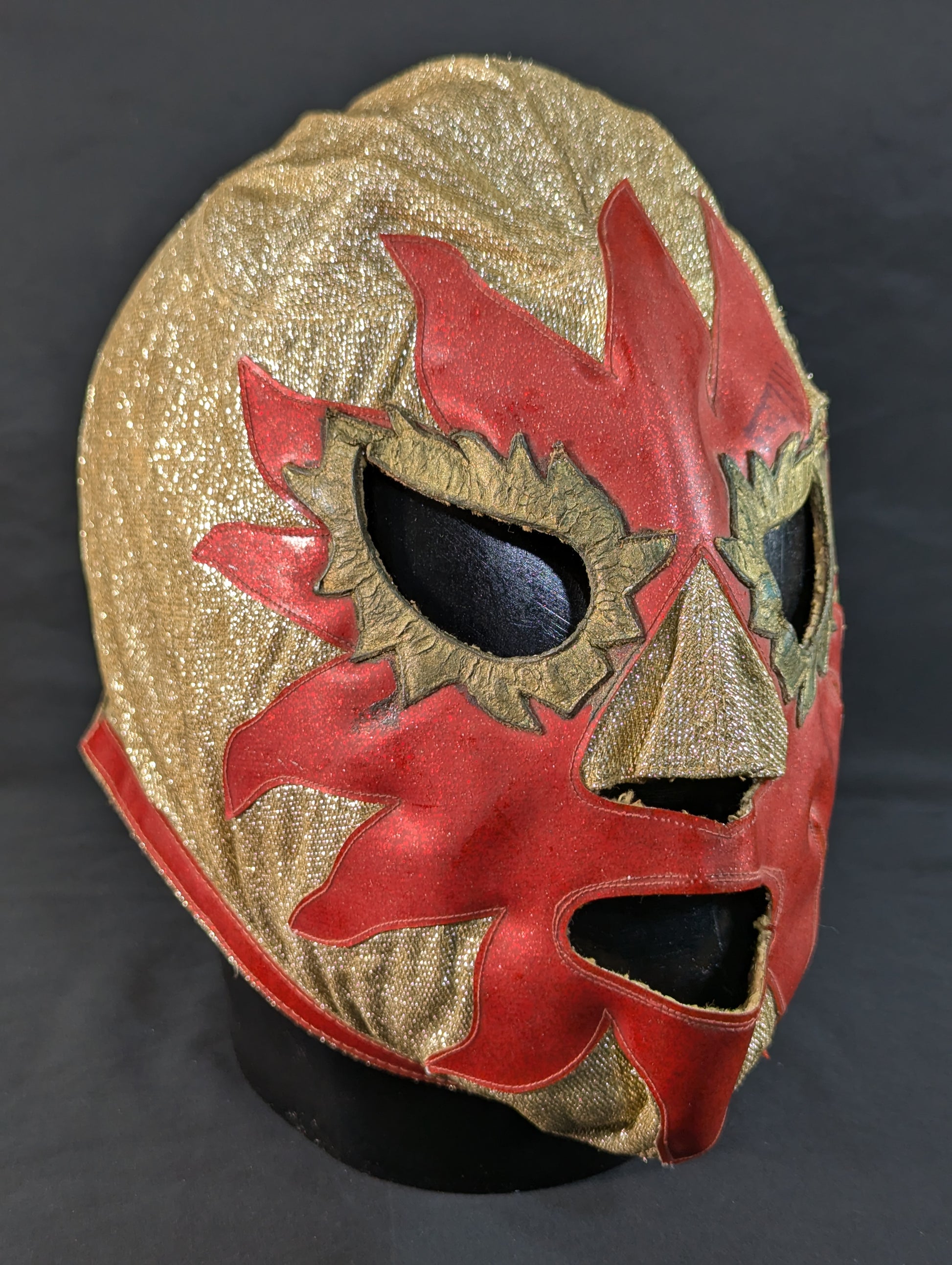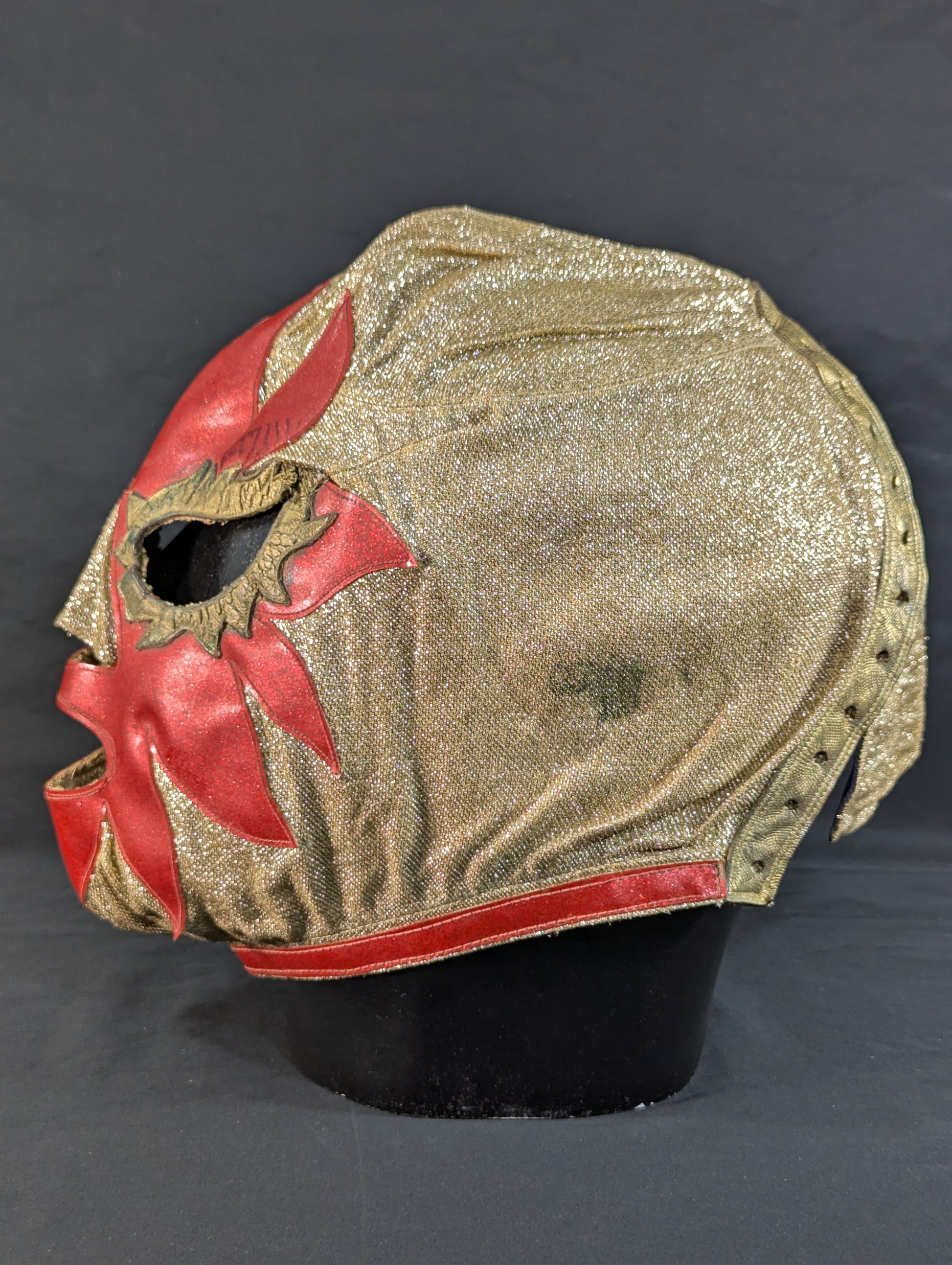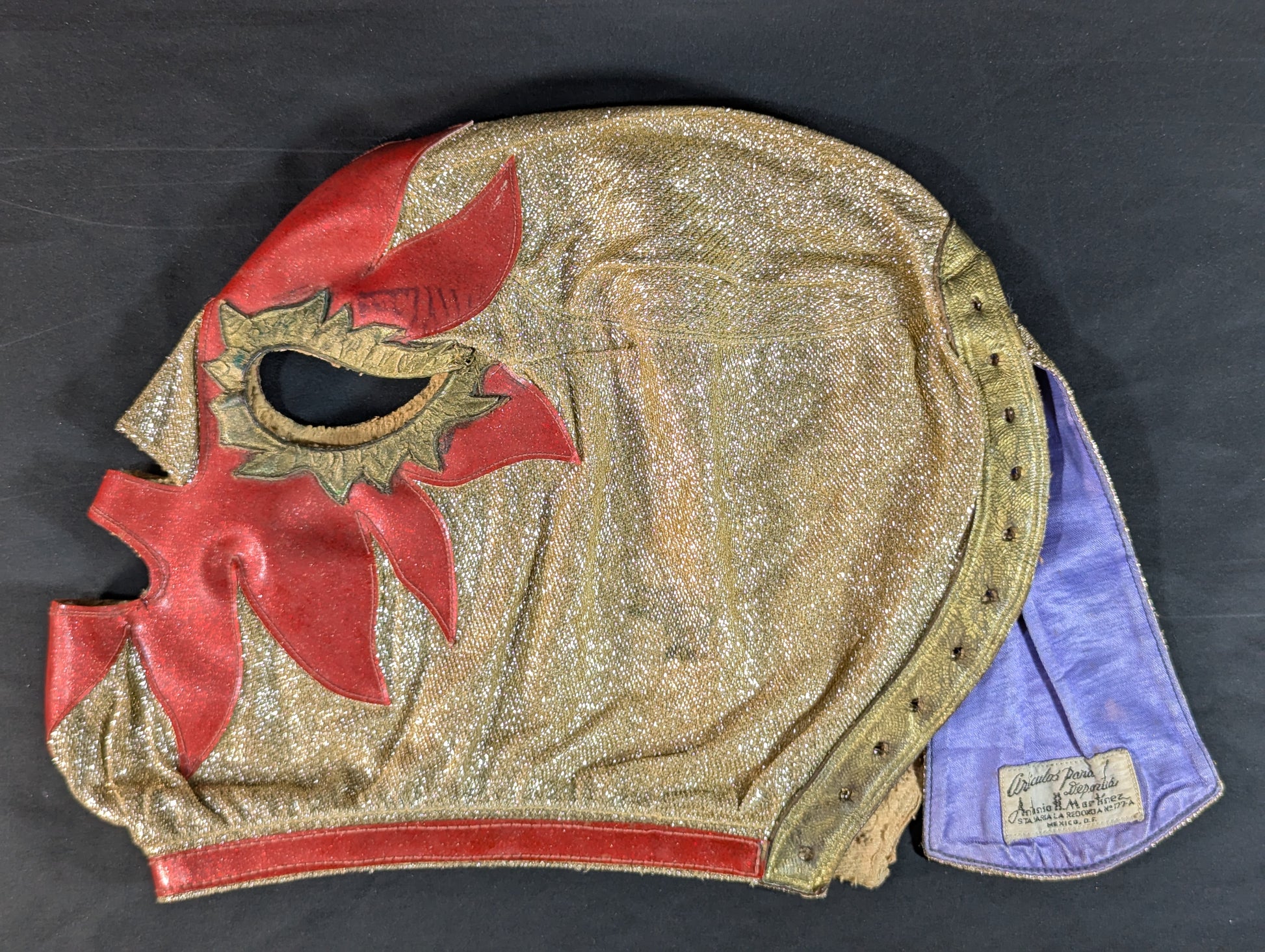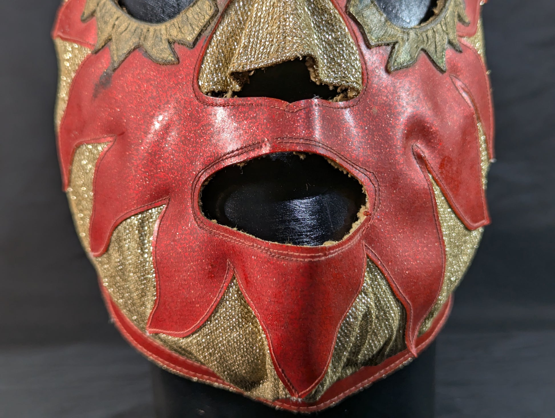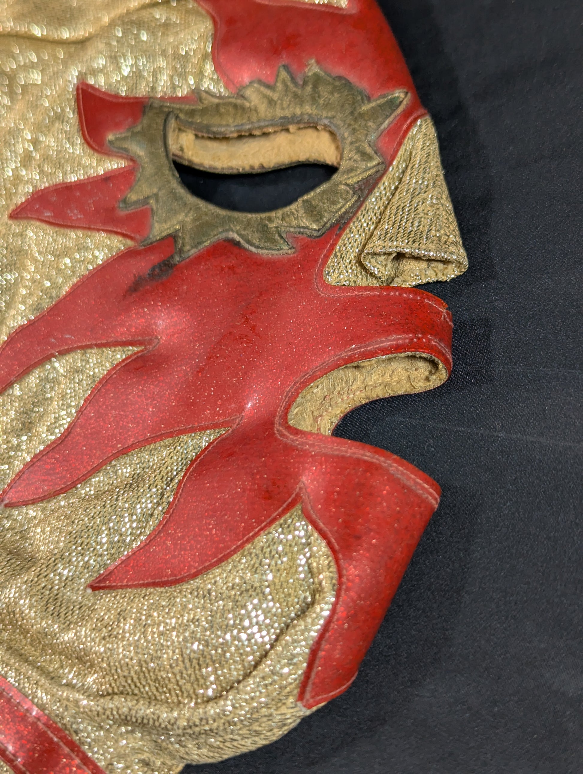 ★本人実使用!! 70年代当時モノ★ 旧金ラメ 赤特殊フチ&金革フチ(紐通し部分も同色本革) ベロは同色の旧ラメと青紫色の旧サテン生地 喉テープは縦幅1.6cmで薄青のセンターステッチ 横タグ ~神秘なるマスク芸術~マルチネス編の30ページに掲載されている現物マスク 1970年代中期にアントニオ・ウンベルト・マルチネス氏により製作されたもの